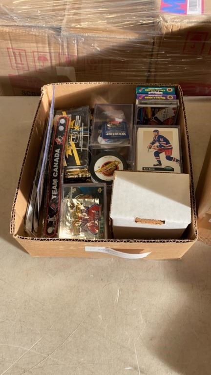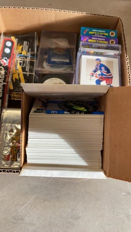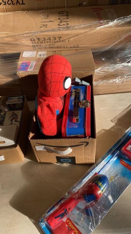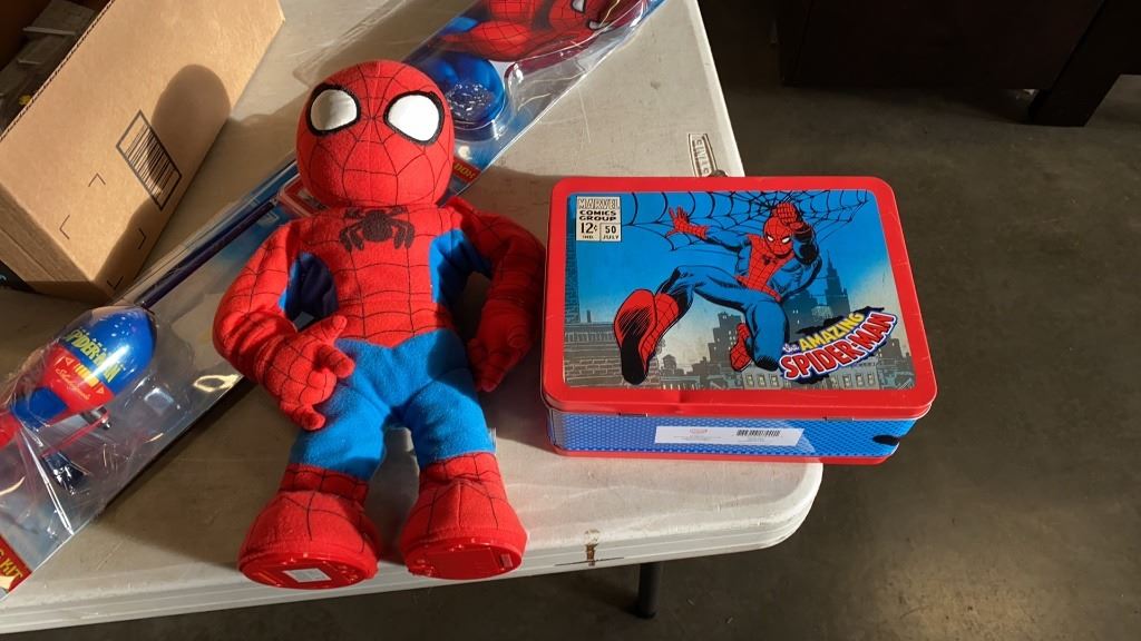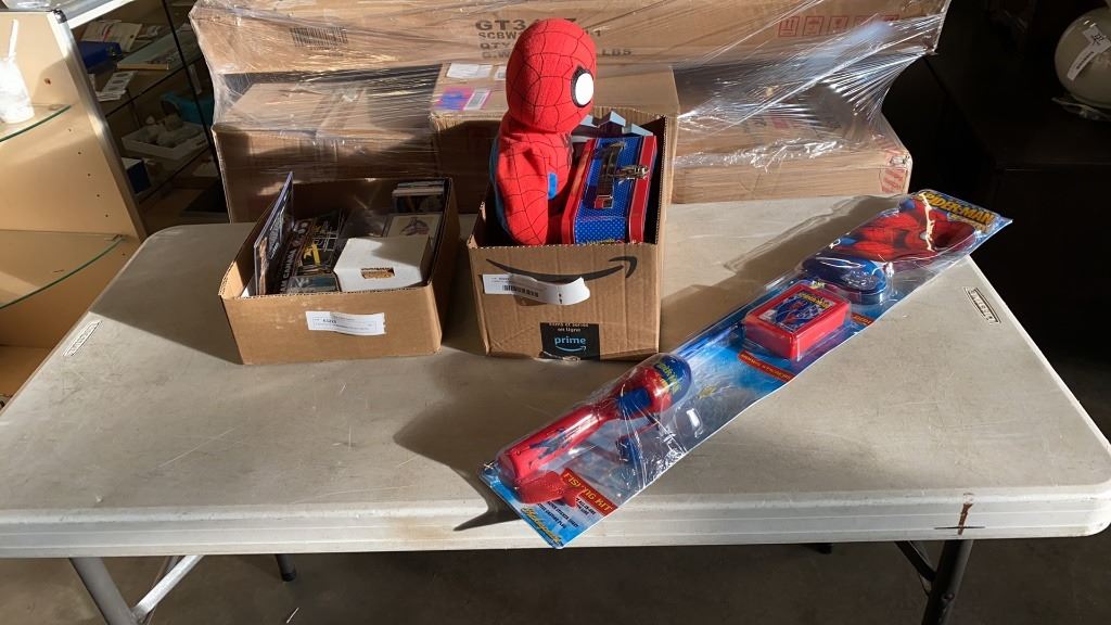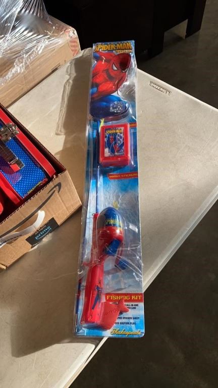 2 BOXES OF SPIDERMAN COLLECTIBLES, FISHING ROD AND HOCKEY CARDS