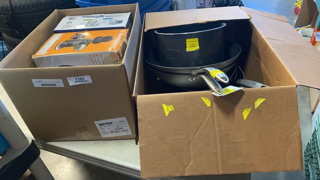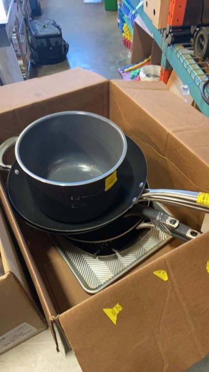 2 BOXES OF STORE RETURNED POTS, PANS AND MORE