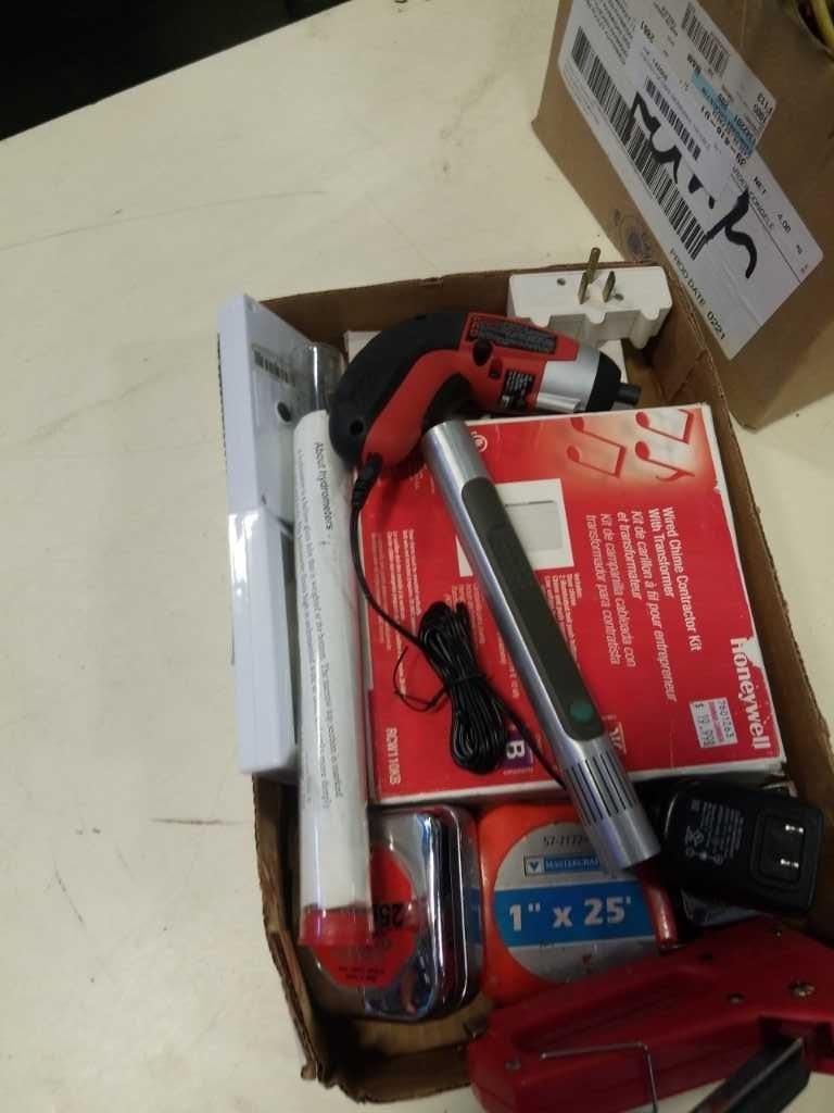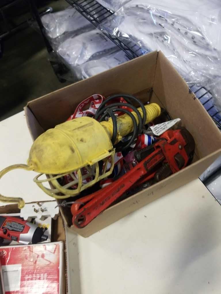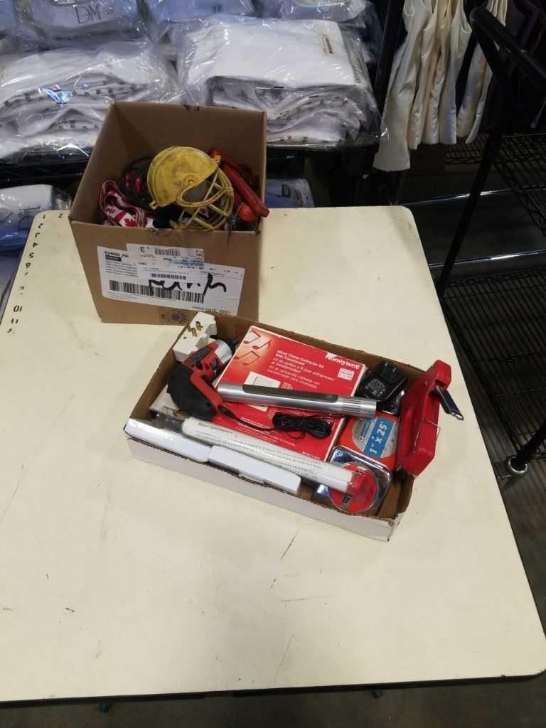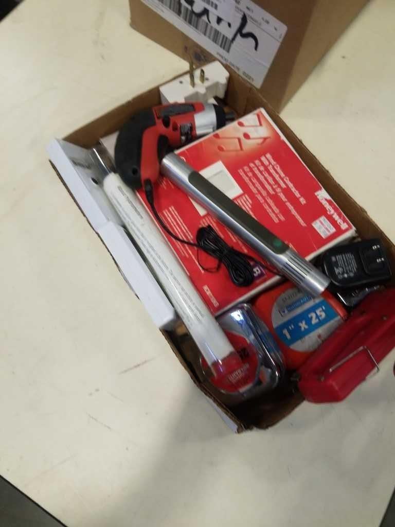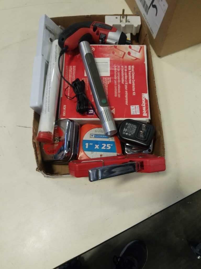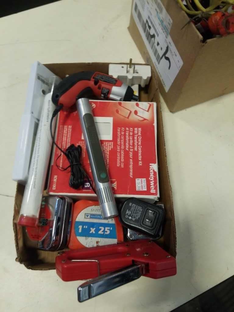 2 BOXES OF TAPE MEASURES, TROUBLE LIGHT AND MORE