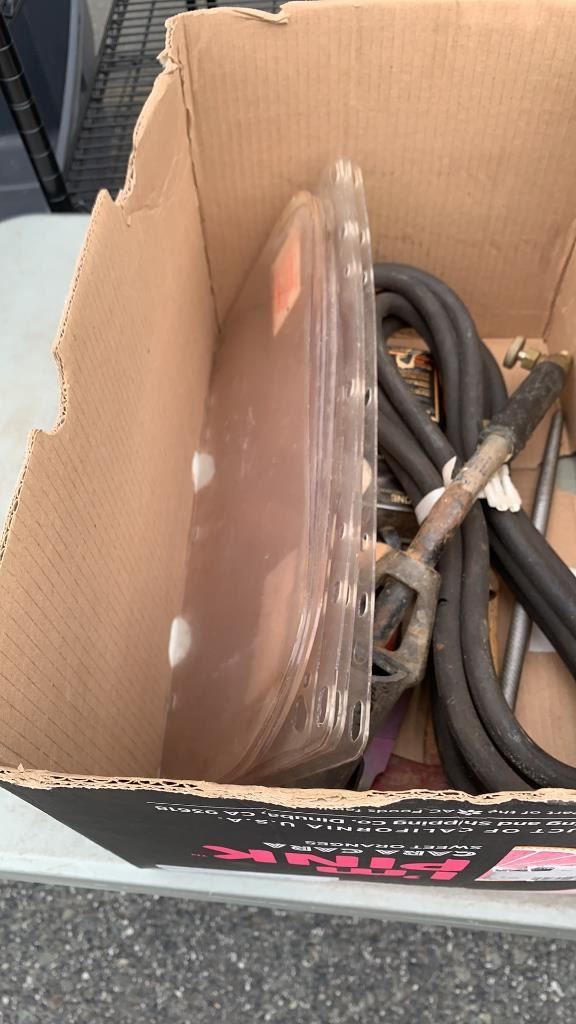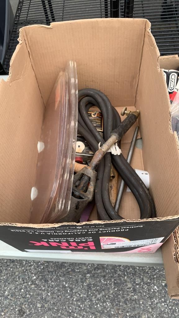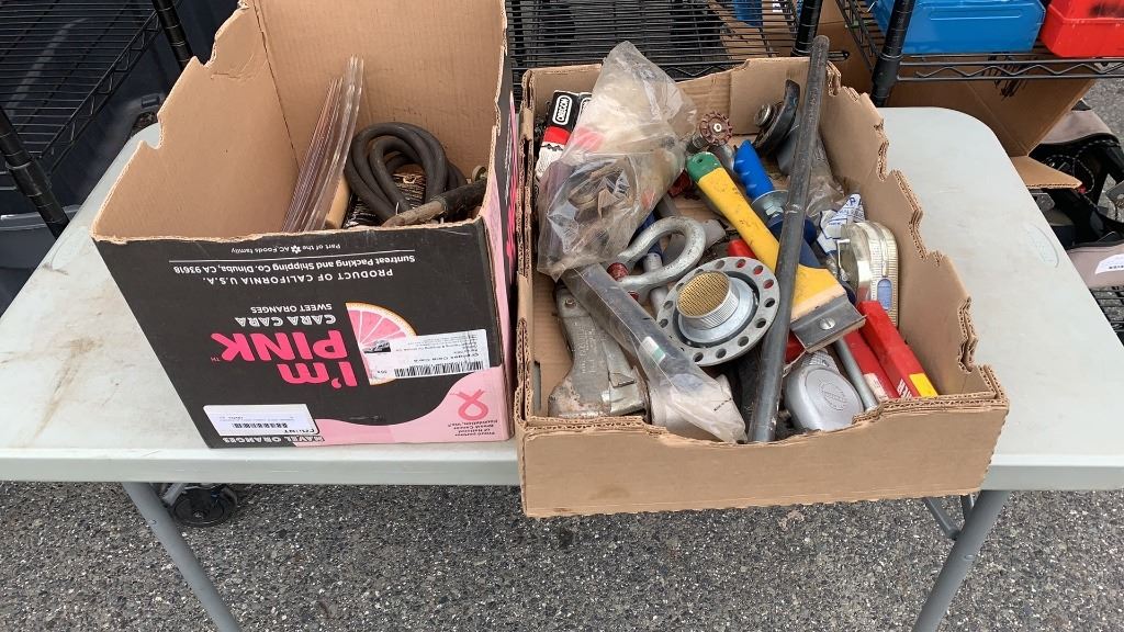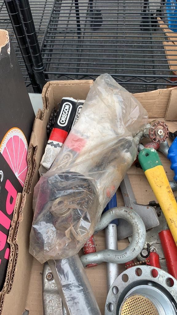 2 BOXES OF TIGER TORCH, SLIDE HAMMER, CHAINSAW CHAINS AND MORE