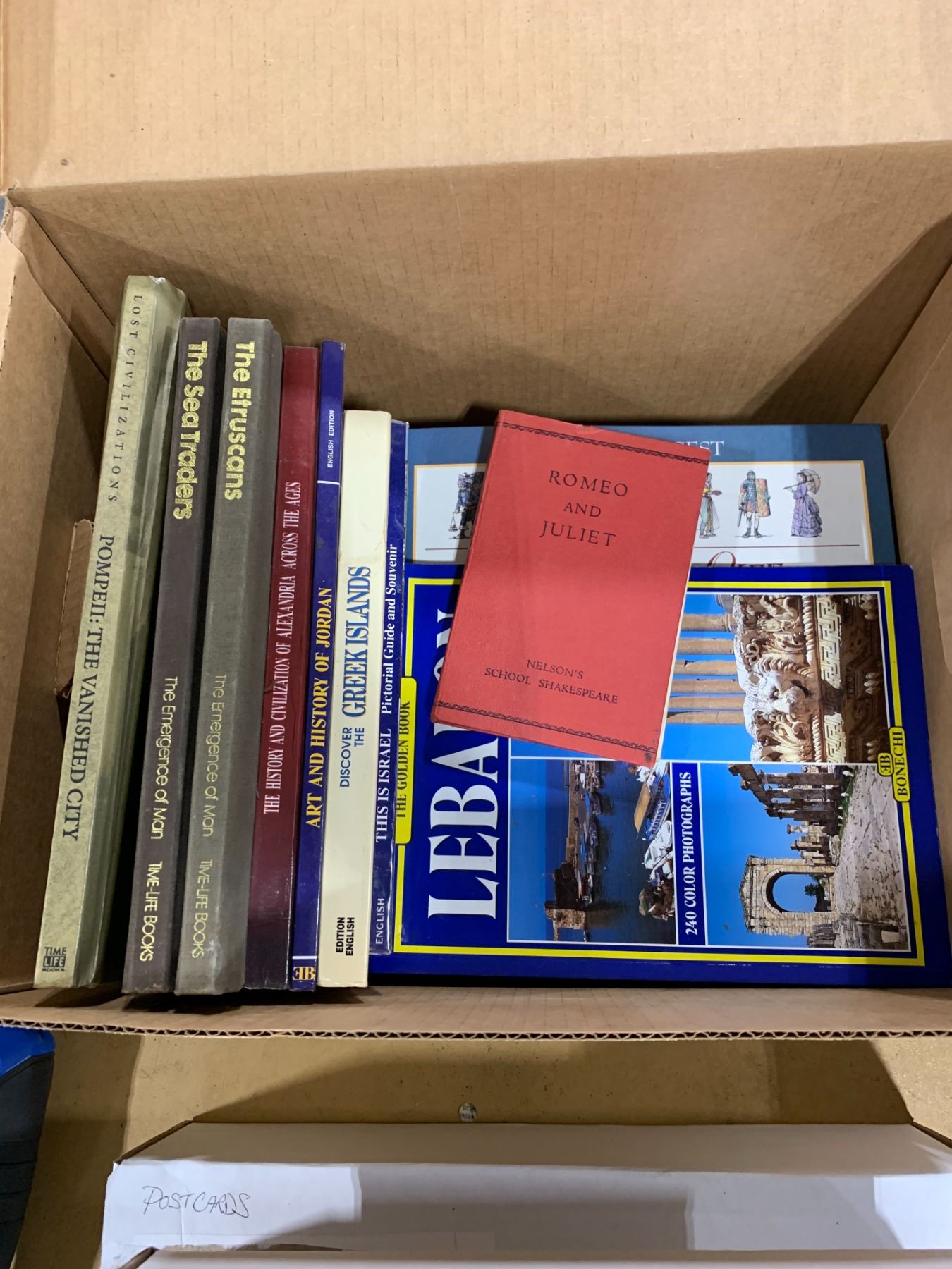 2 BOXES OF TRAVEL POST CARDS, BOX OF TRAVEL BROCHURES & BOX OF ASSORTED BOOKS