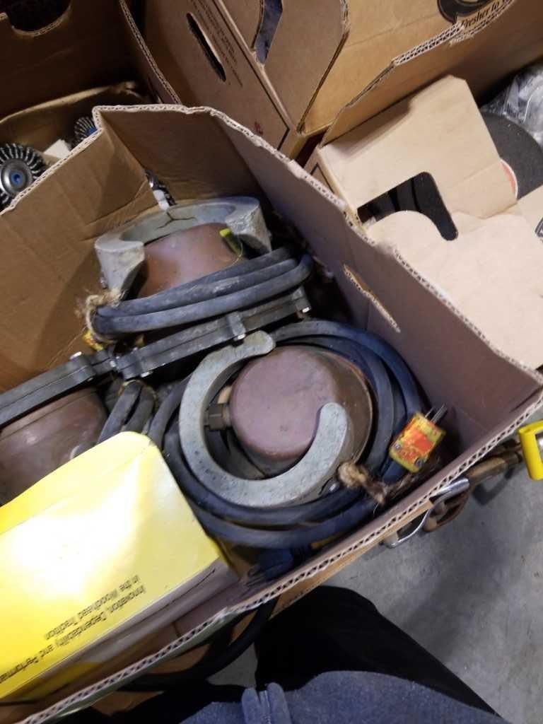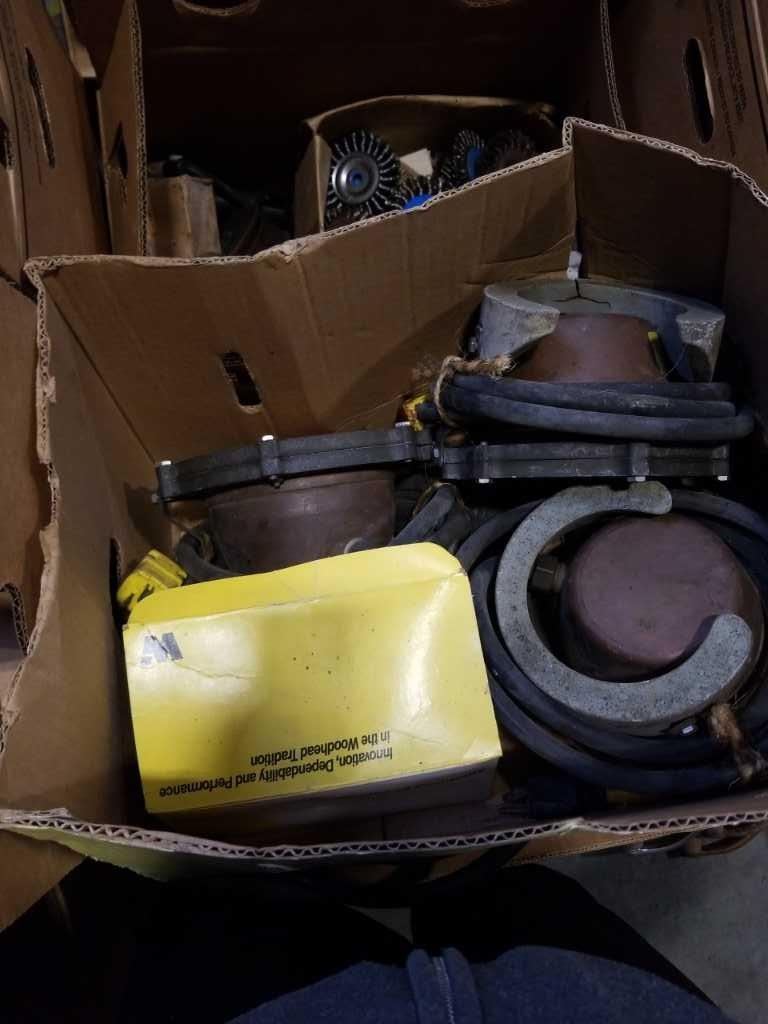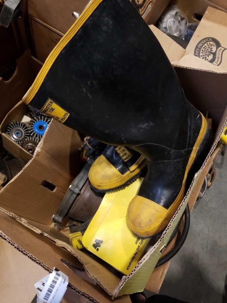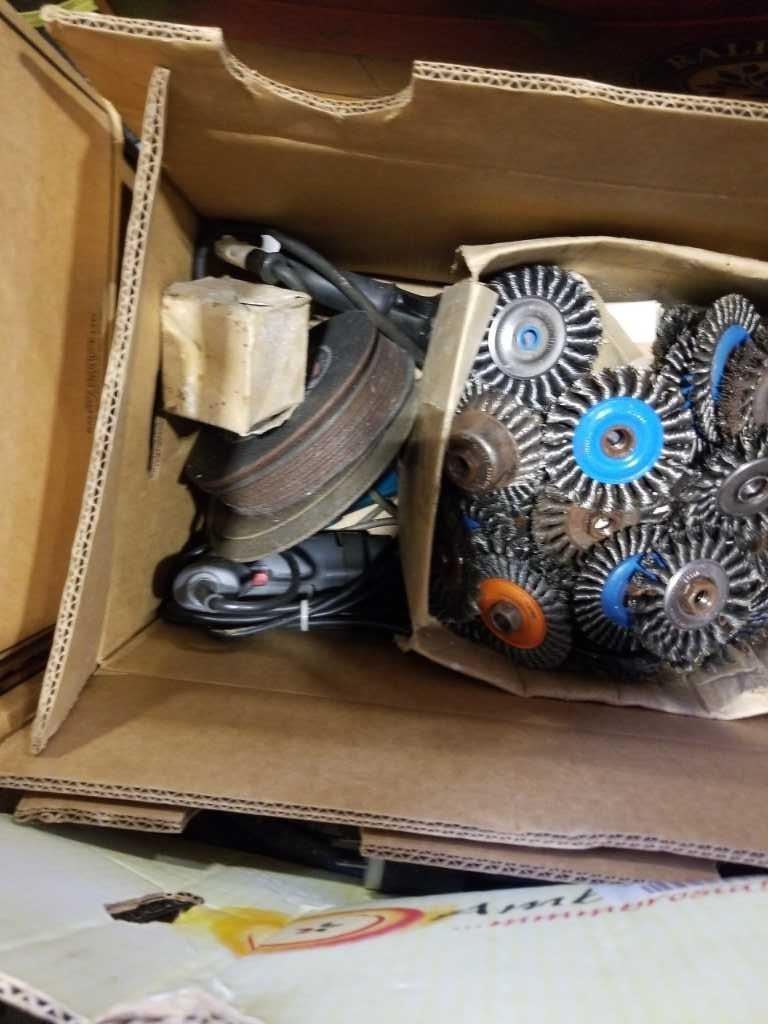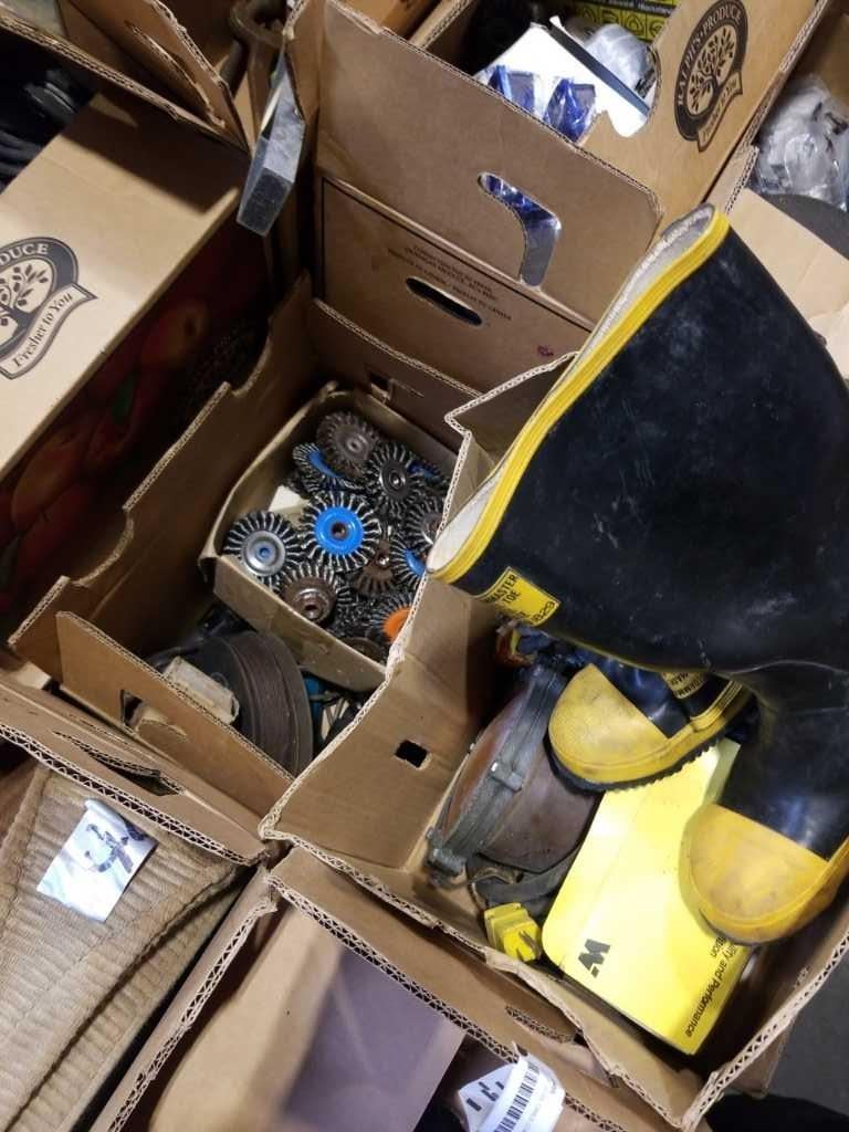 2 BOXES OF WIRE BRUSH WHEELS, CUTTING WHEELS, BOOTS, LIGHTS, SHOP SUPPLIES