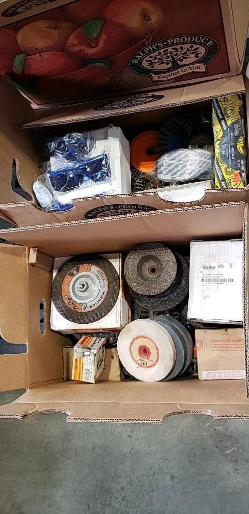 2 BOXES OF WIRE BRUSH WHEELS, GRINDING WHEELS, SAFETY GLASSES