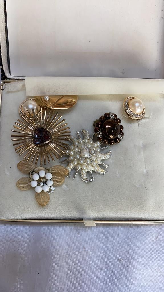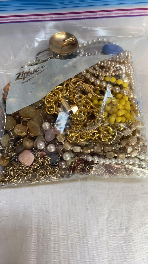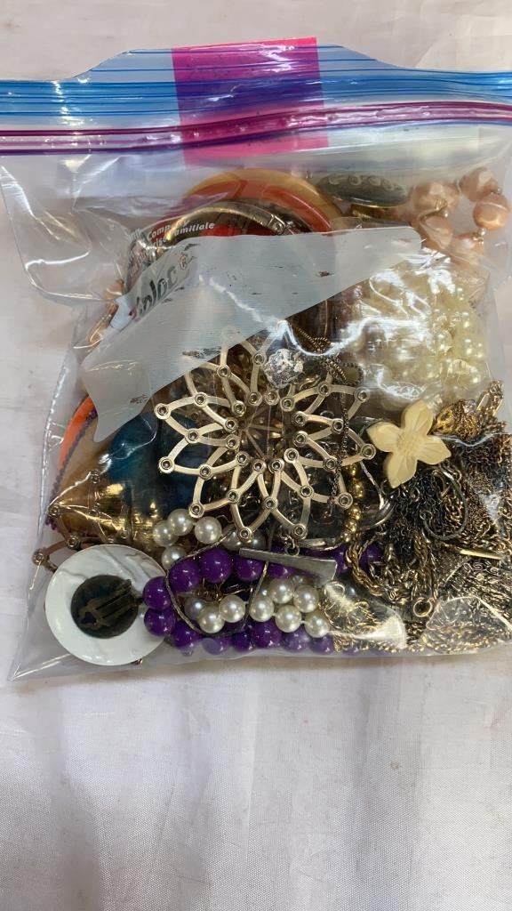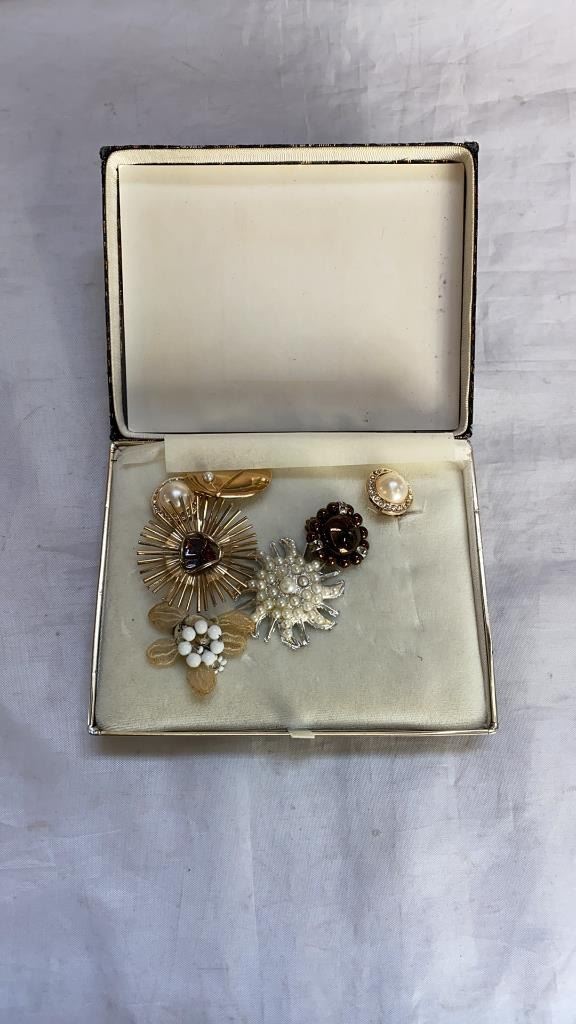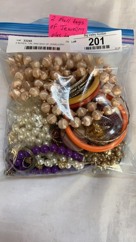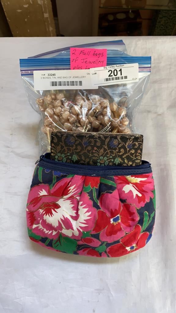 2 BOXES, TIN, AND BAG OF JEWELLERY