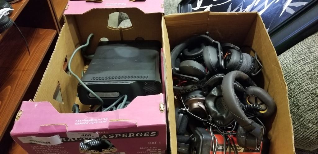 2 BOXES W/ XBOX CONSOLE, CONTROLLERS, HEADPHONES, ETC