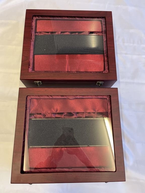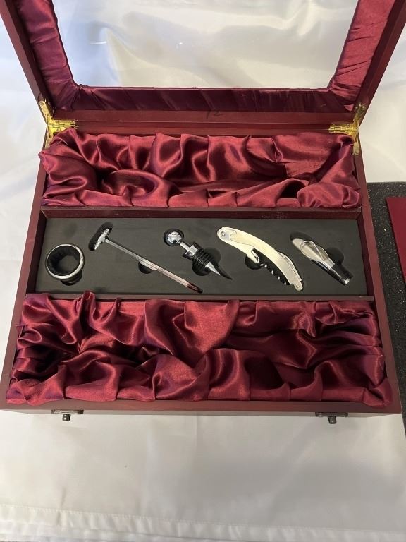 2 BRAND NEW WINE GIFT BOXES - 2 BOTTLE WINE BOX W/ CORKSCREW, 3 BOTTLE STOPPERS, THERMOMETER, POURER
