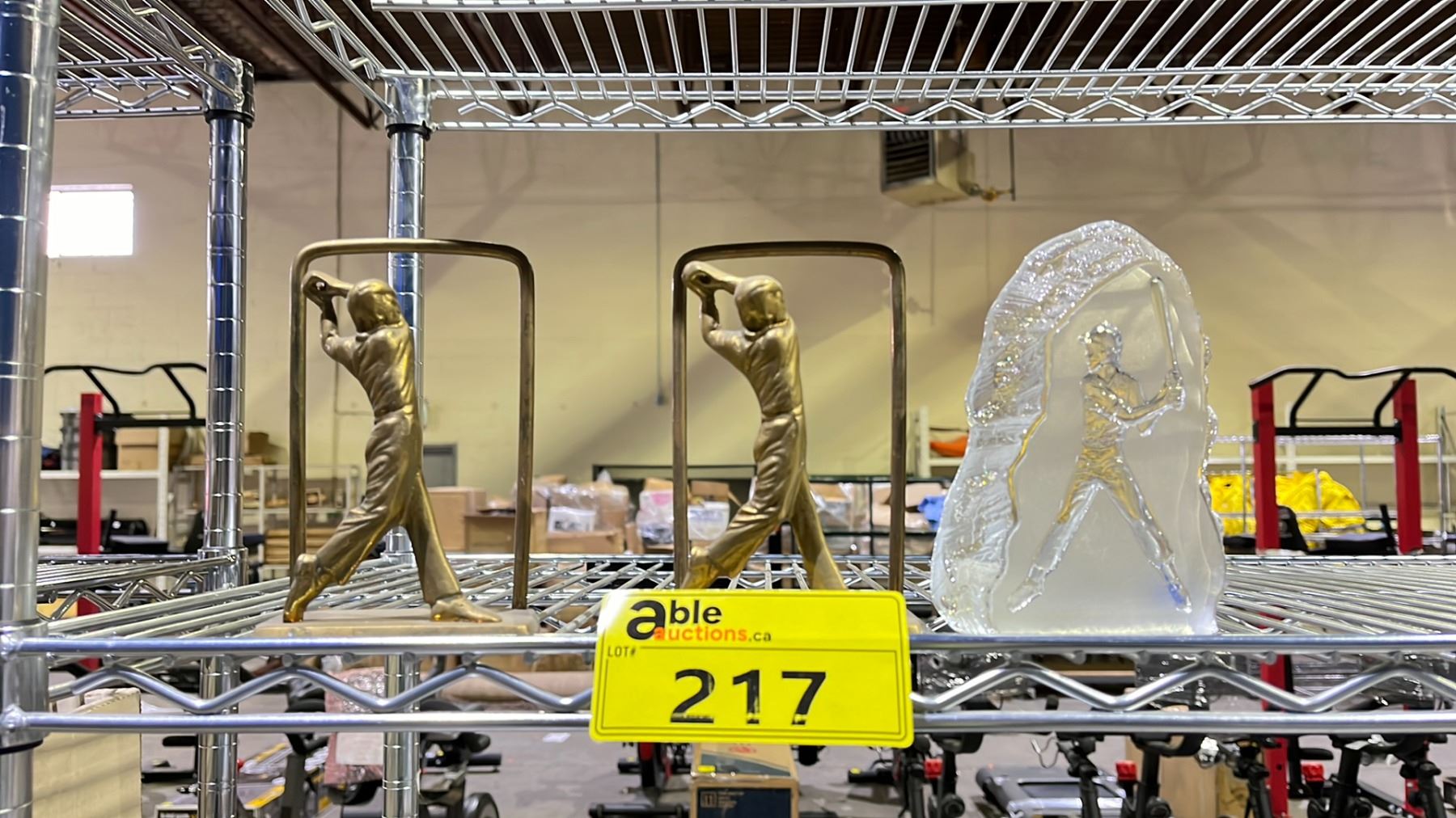 2 BRASS GOLF FIGURES & GLASS BASEBALL IMPRINT FIGURE