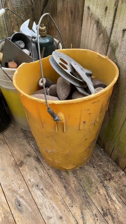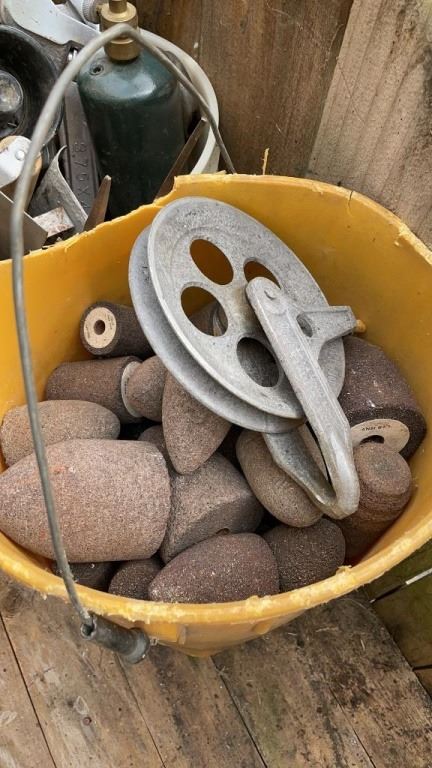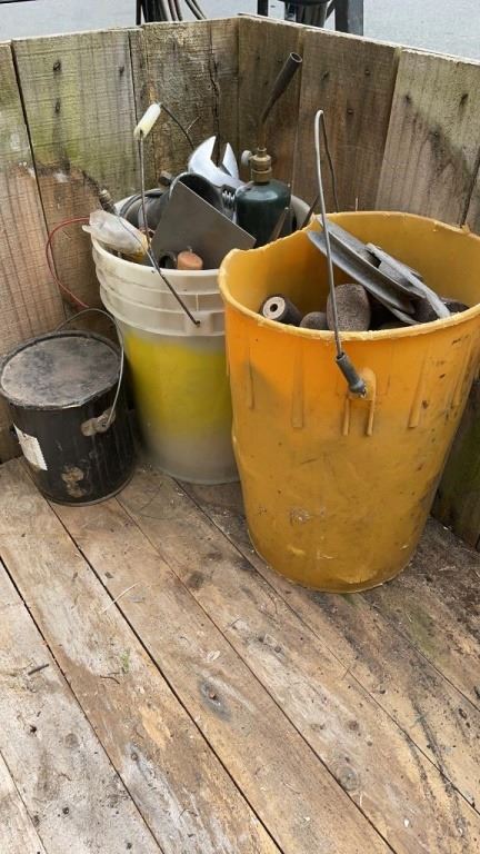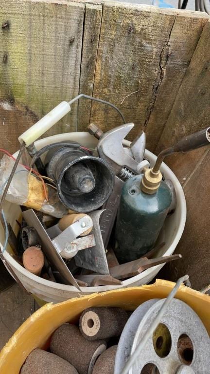 2 BUCKETS OF TOOLS, GRINDING BITS AND CAN OF COLD GALVANIZED COMPOUND