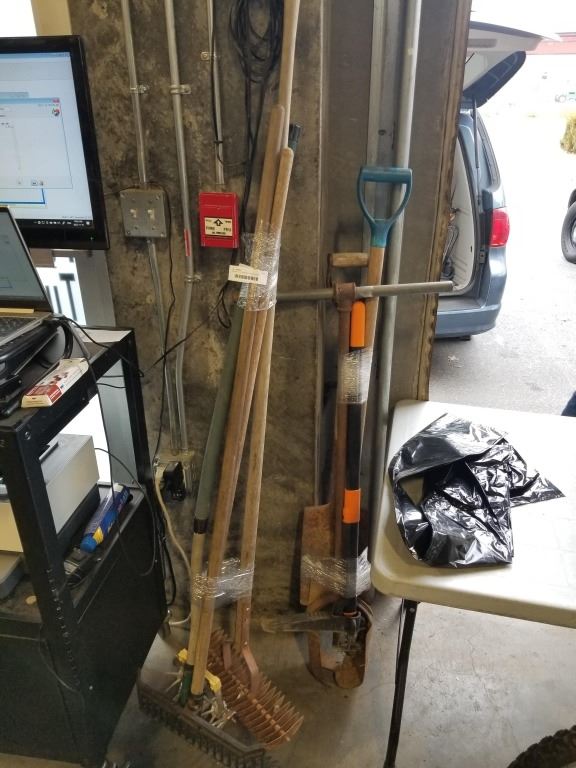 2 BUNDLES OF GARDEN TOOLS, RAKES, SHOVEL, PRUNER