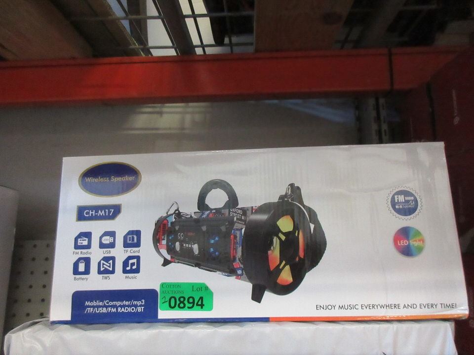 Radio/MP3/TF/USB/FM Radio/BT. 16" long x 6" diameter. Has carry strap.
