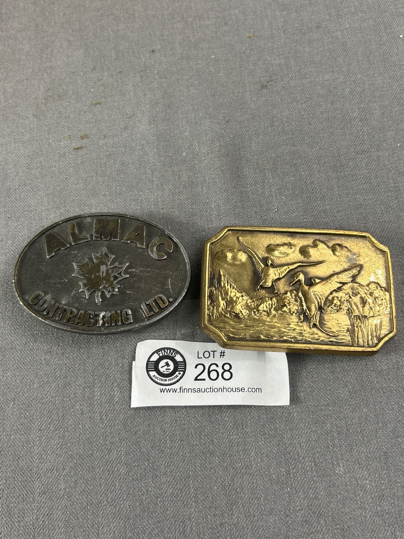 2 Belt Buckles - 3" x 2" Solid Brass "Ducks" & 3" Metal Oval "Almac Contracting Ltd"
