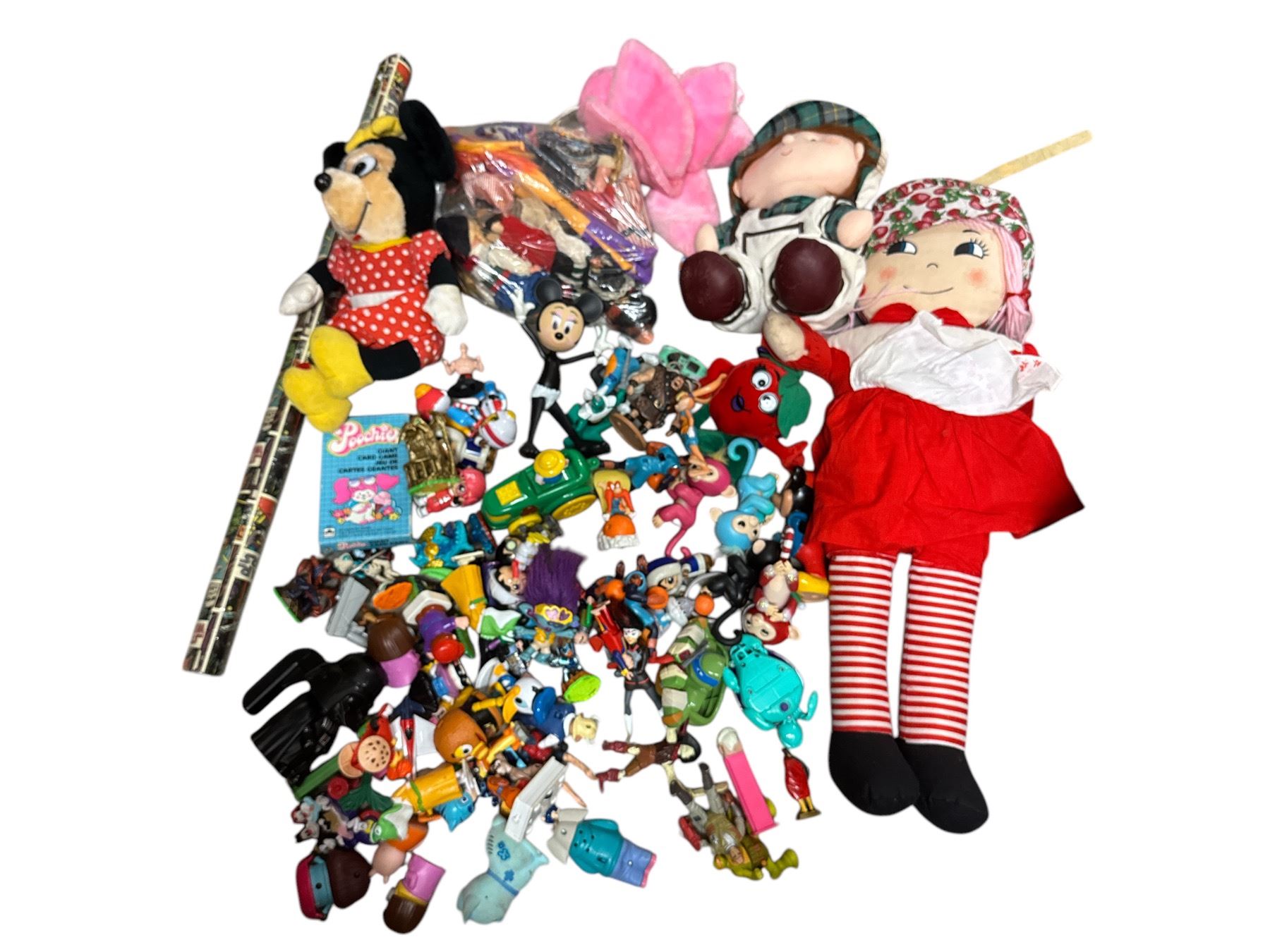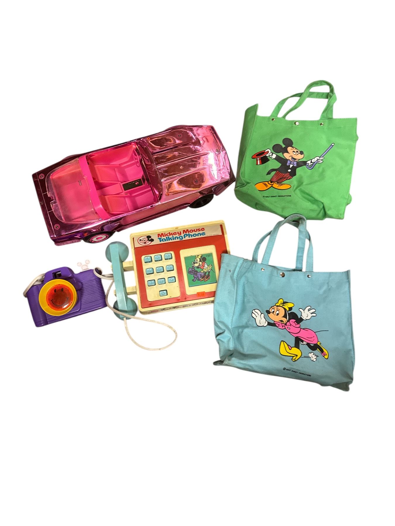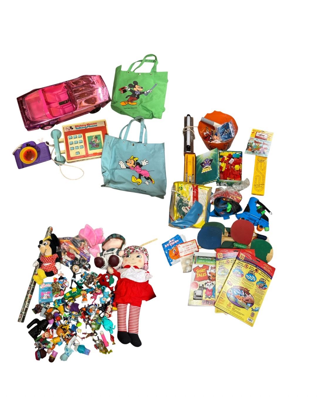2 Bins Of Assorted Toys: Mickey Mouse, Cars. Camera, Ping Pong Paddles, & More