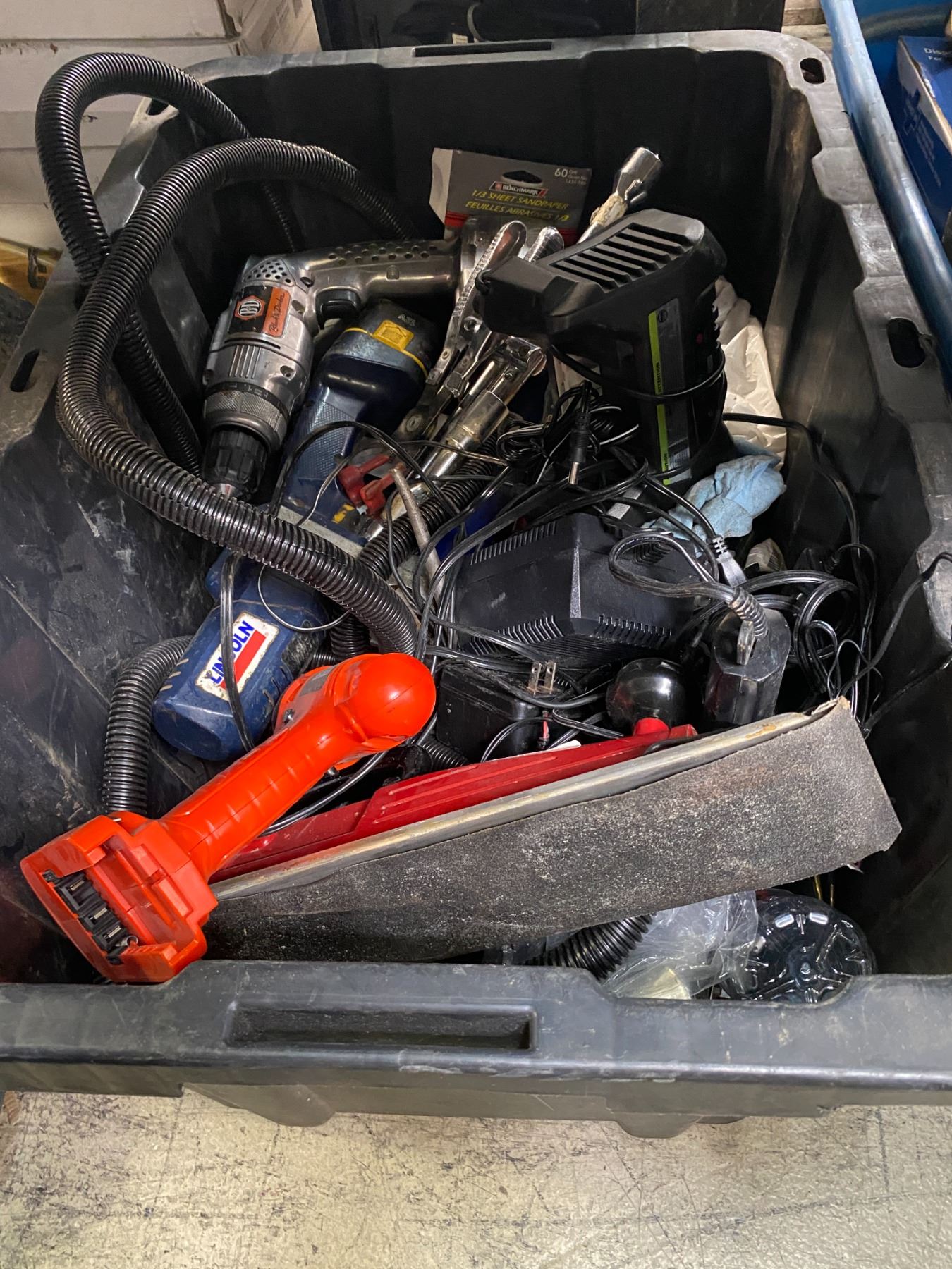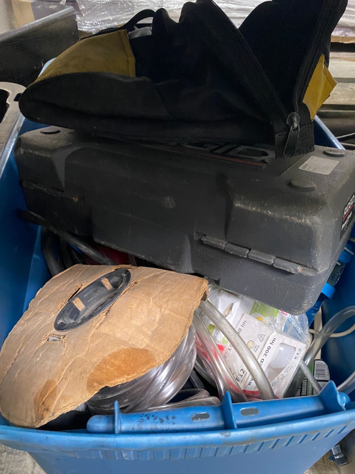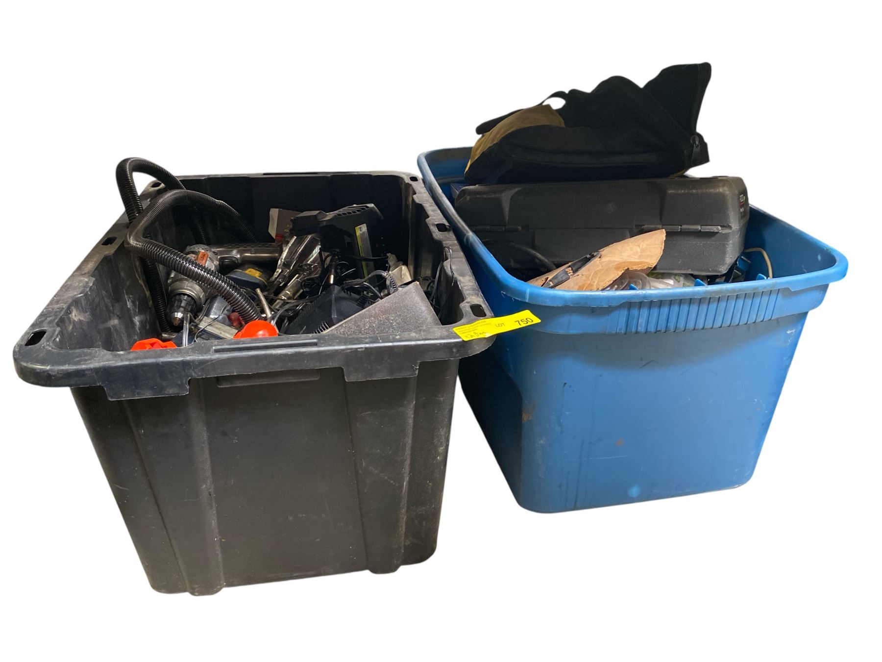 2 Bins of Mixed Tools, Drill, Ridgid Case & Accessories
