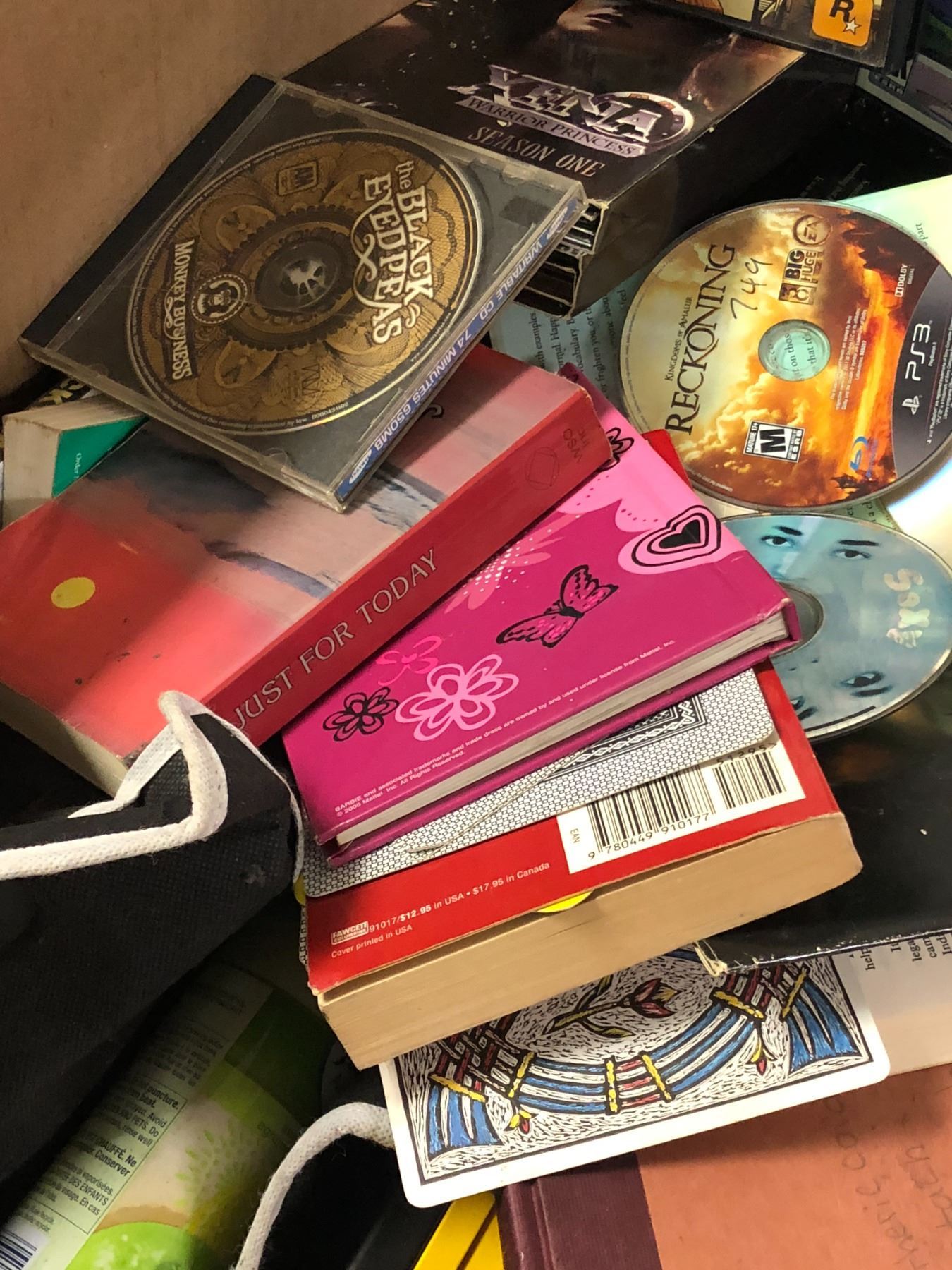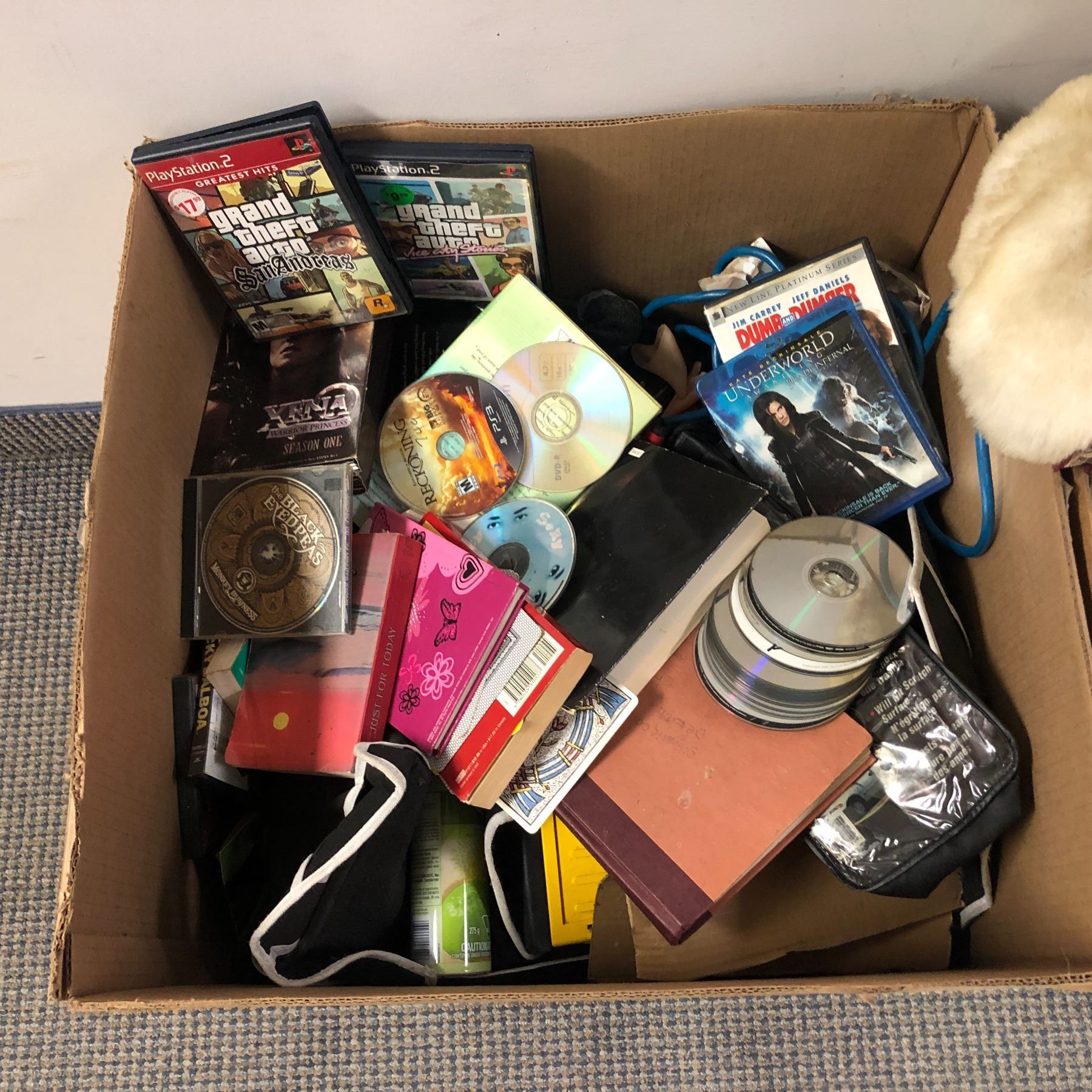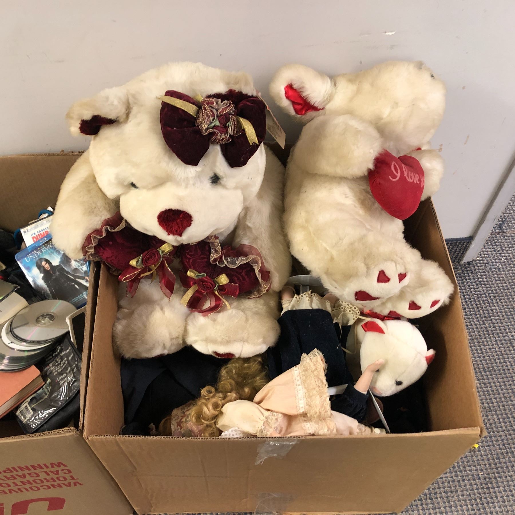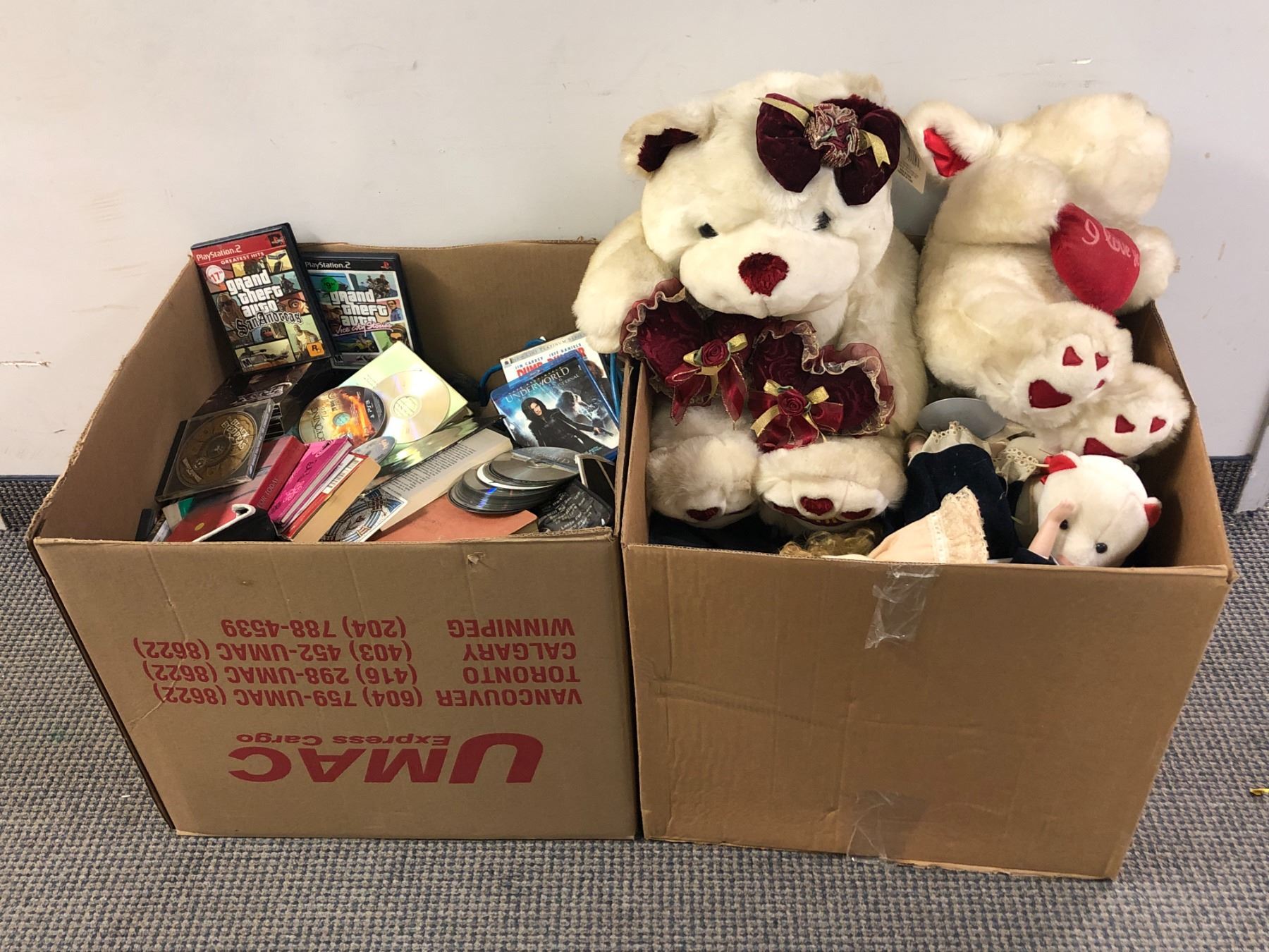 2 Boxes full of assorted items - includes DVDs / Playstation games / white teddy bear plush / dolls etc