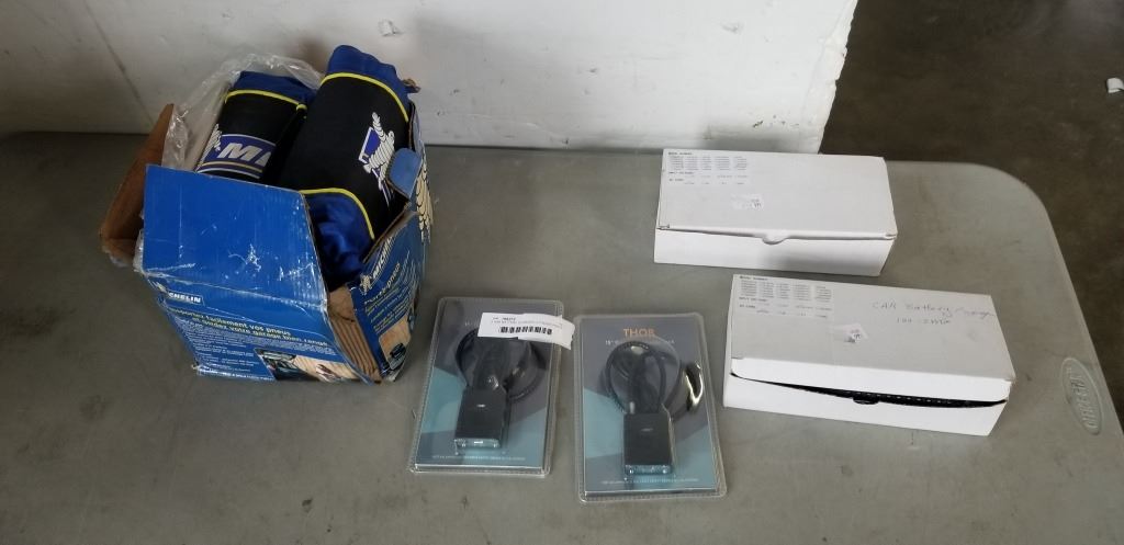 2 CAR BATTERY CHARGER, 2 FINGER PRINT LOCKS, AND 4 TIRE COVERS