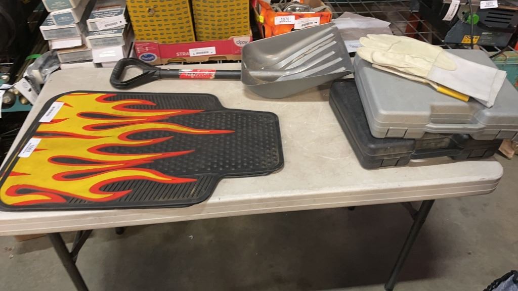2 CAR MATS, SOCKETS AND SNOW SHOVEL
