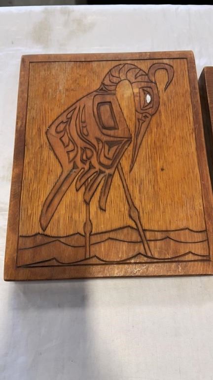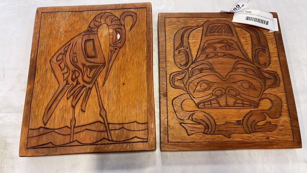 2 CARVED WOOD FIRST NATIONS PLAQUES ONE WITH INLAID EYE