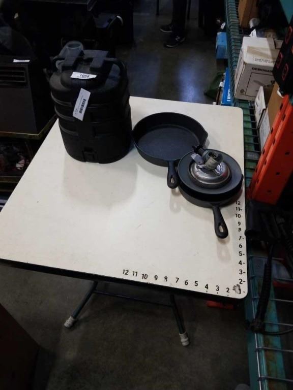 2 CAST IRON FRYING PANS AND WOODS CAMP LANTERN