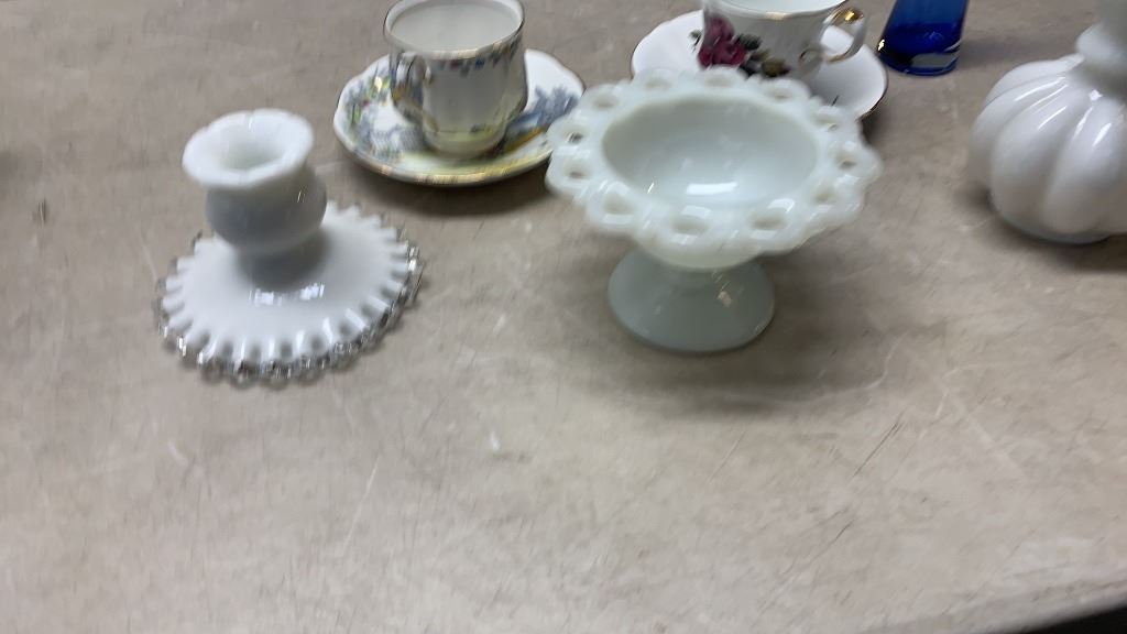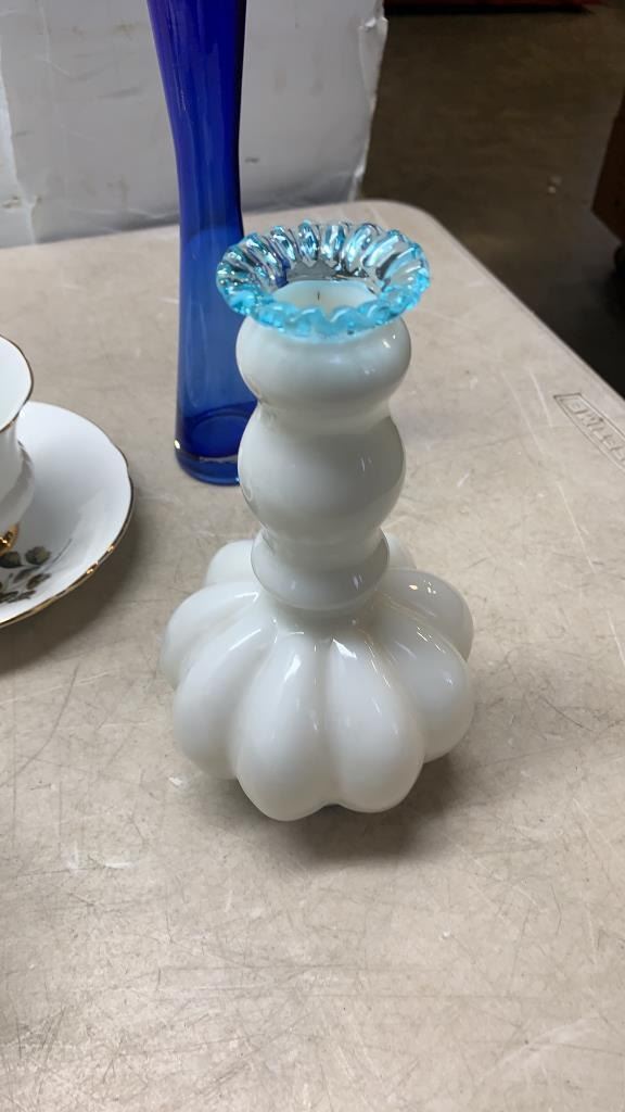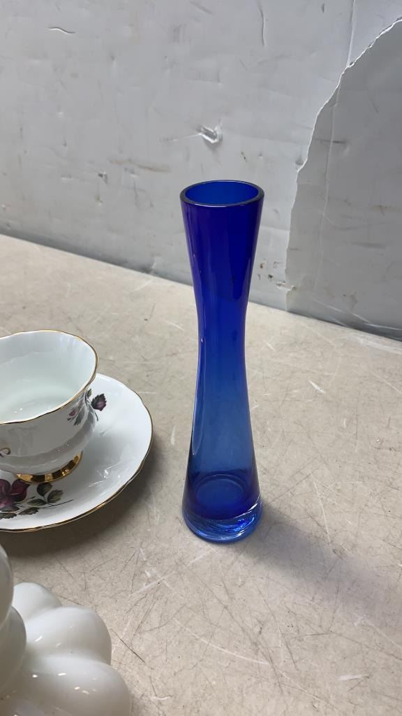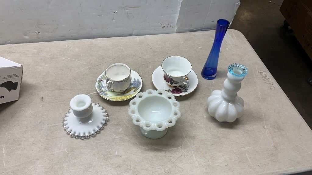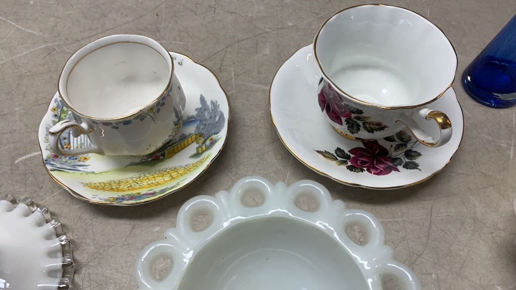 2 CHINA CUPS AND SAUCERS AND ART GLASS - ROYAL ALBERT, MILLERS