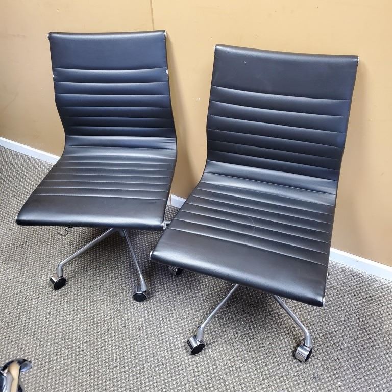 2 CHROME AND BLACK LEATHER LOOK ROLLING OFFICE CHAIRS