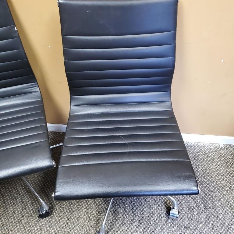 2 CHROME AND BLACK LEATHER LOOK ROLLING OFFICE CHAIRS