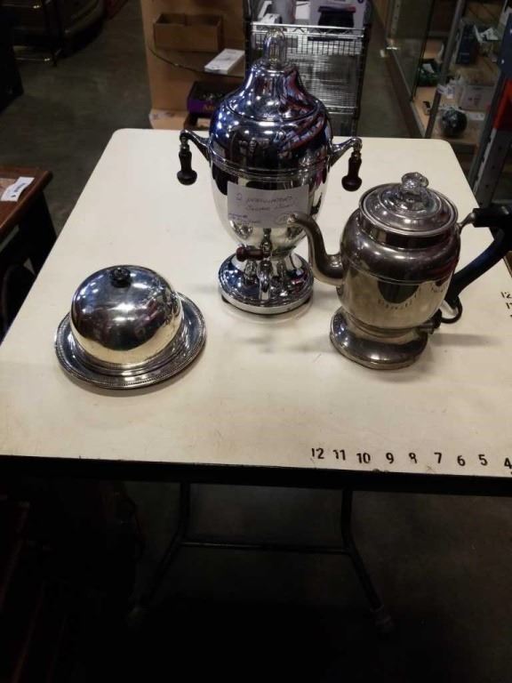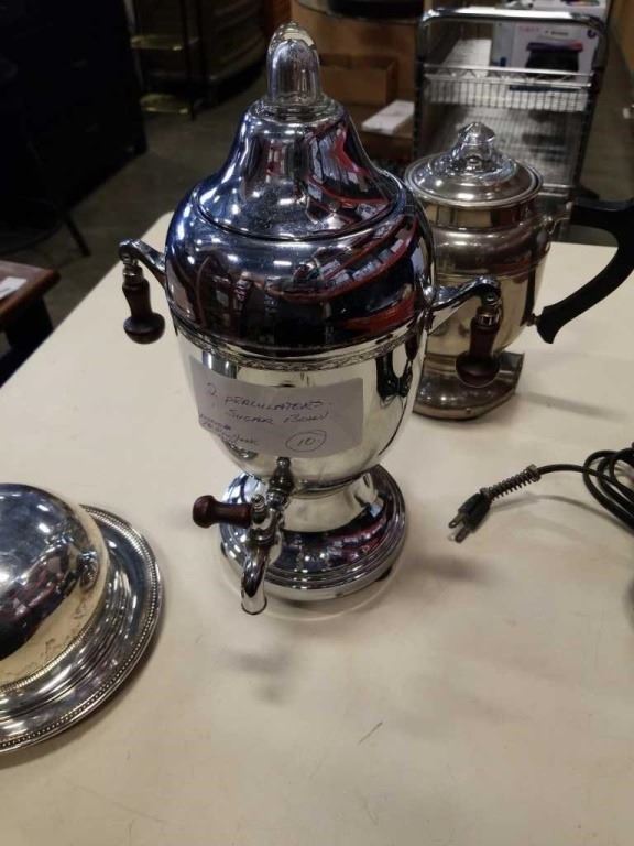 2 COFFEE PERCULATORS AND SUGAR BOWL WITH SPOON