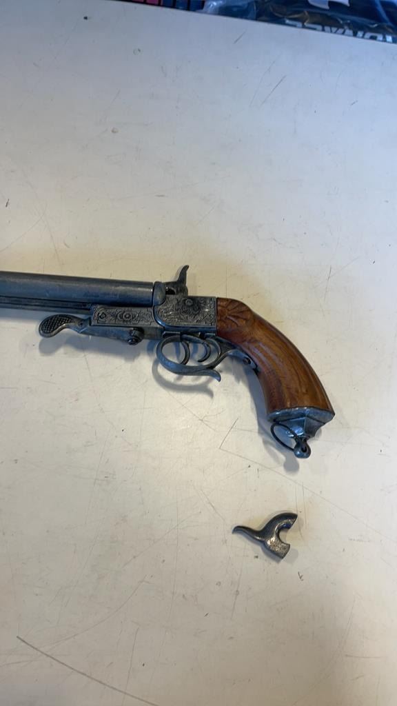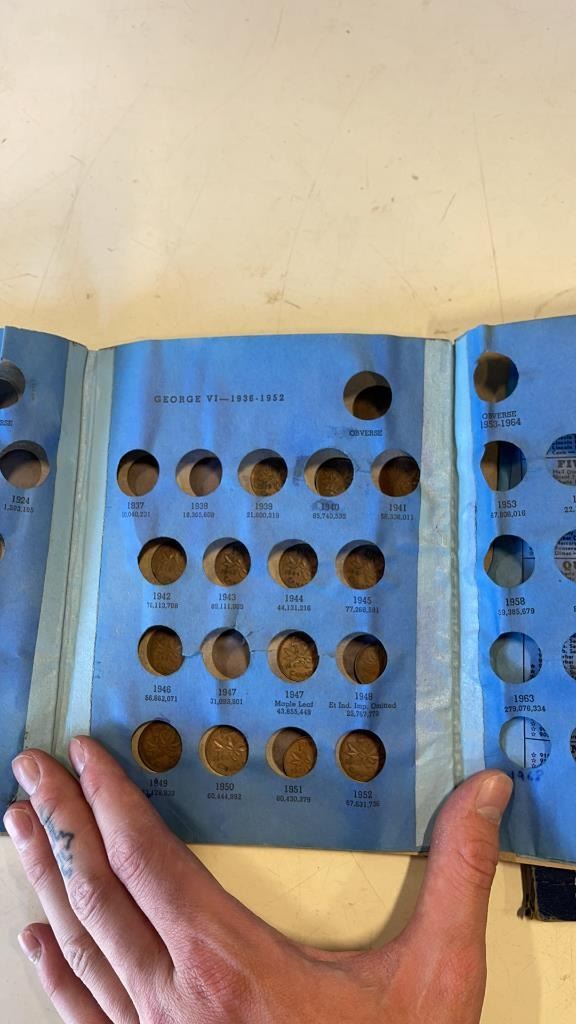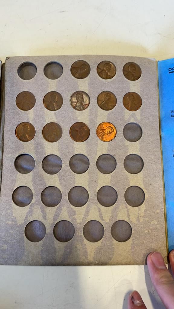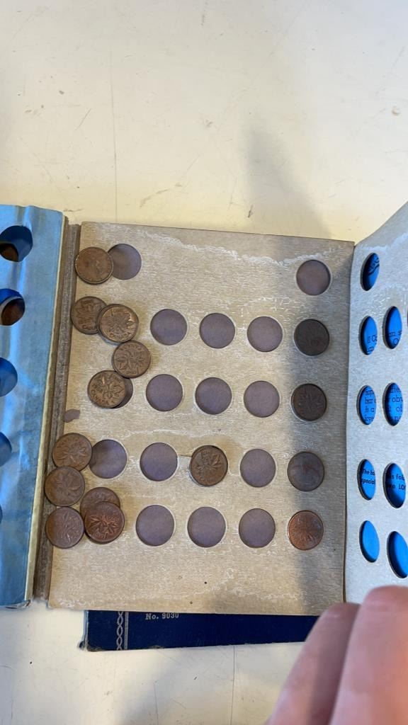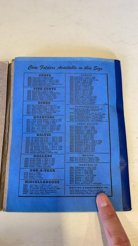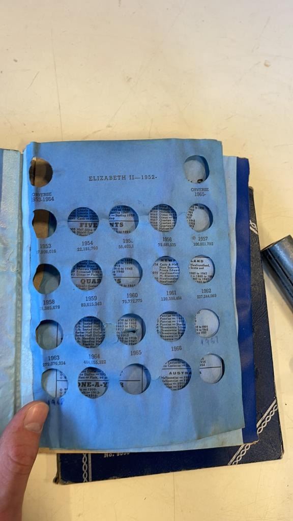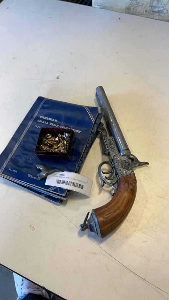 2 COIN BOOKS WITH SOME COINS, PINS AND REPLICA PISTOL