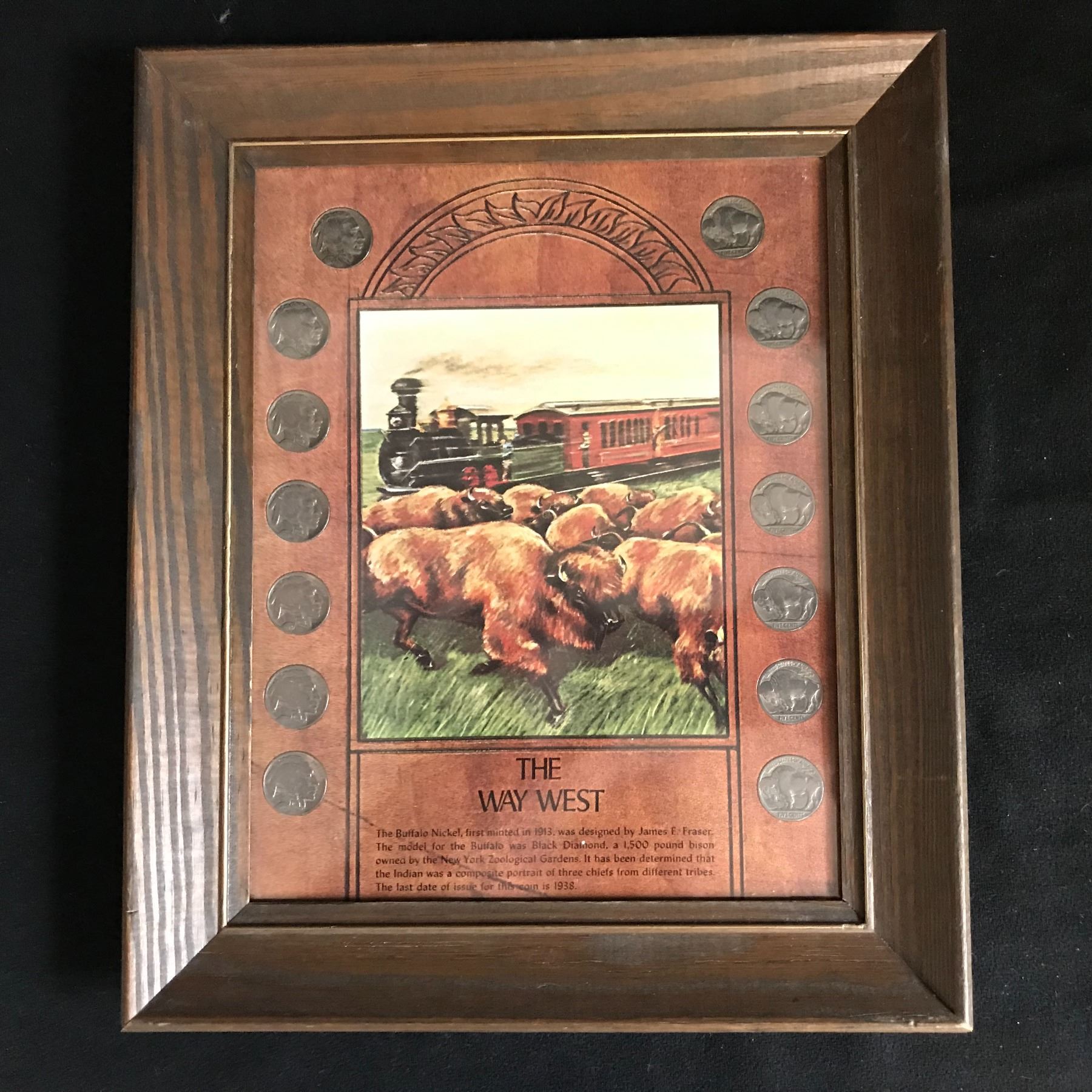 2 Framed Coin SetsBoth sets have wooden frames and a plexiglass covering over the coins. They measure approximately 10" by 12" including the frames. The following two sets are included:THE FORTY NINERS Liberty Head Nickels - includes 9 Liberty Head Nickels. The Liberty Head Nickel was designed in 1883 by Charles E. Barber. On the obverse is a delicately profiled Liberty Head and thirteen stars. In the original design a large "V" appeared on the reverse, but the word "cents" was missing. This oversight was corrected in 1883 and the amended version was minted until 1913. THE WAY WEST Buffalo Nickels - includes 14 Buffalo Nickels. The Buffalo Nickel, first minted in 1913, was designed by James F. Fraser. The model for the buffalo was Black Diamond, a 1,500 pound bison owned by the New York Zoological Gardens. It has been determined that the Indian was a composite portrait of three chiefs from different tribes. The last date of issue for this coin is 1938