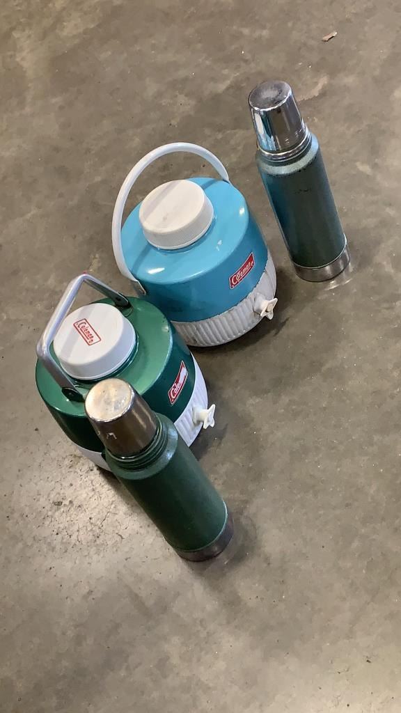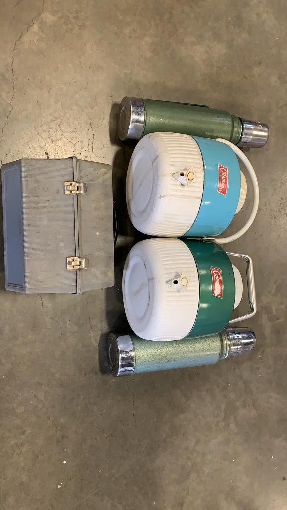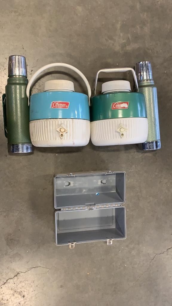 2 COLLECTIBLE COLEMAN DRINK DISPENSERS WITH 2 STANLEY THERMOSES AND LUNCH BOX