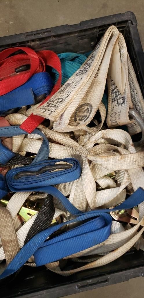 2 CRATES AND TRAY OF LOAD STRAPS, GLOVES, SHOP SUPPLIES, CAR STEREO, ELECTRONICS