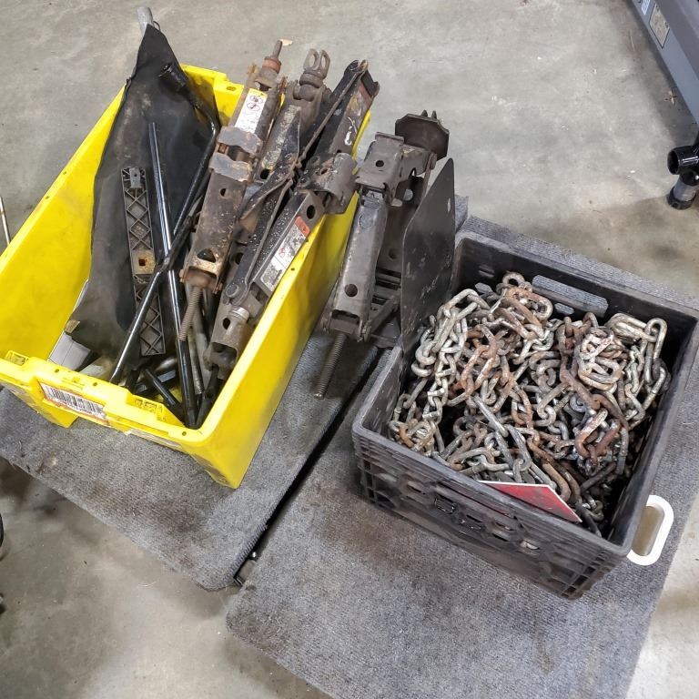 2 CRATES OF WHEEL CHOCK, SCISSOR JACKS AND TIRE CHAINS