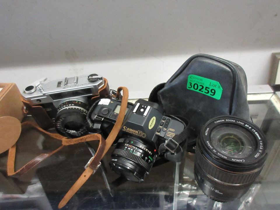 Canon Zoom Lens, Canon T70 Camera and Light O Matic SLR Camera.