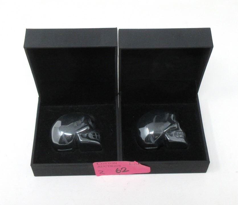 2 Carved Hematite Gemstone Skulls in Fitted Boxes