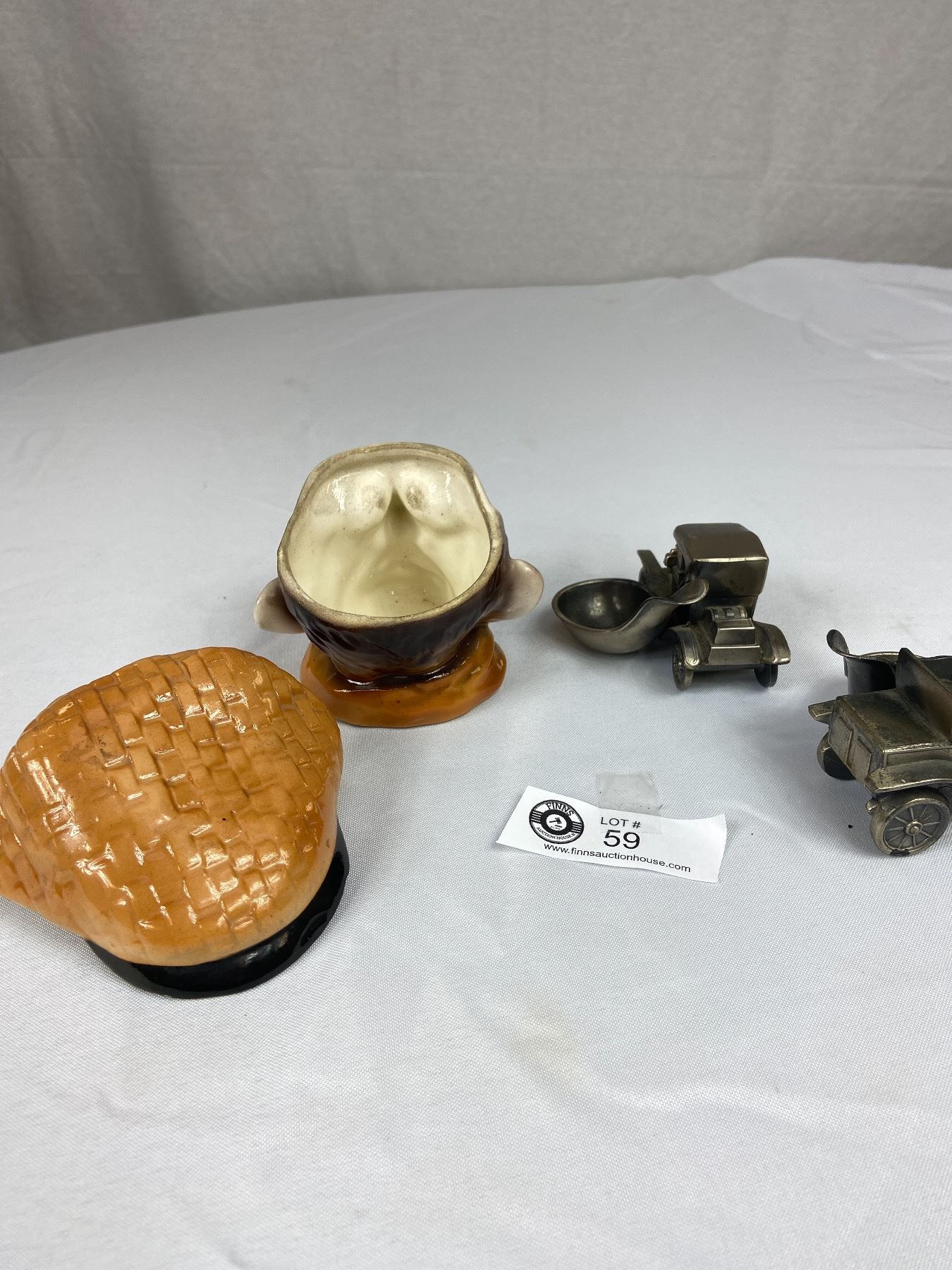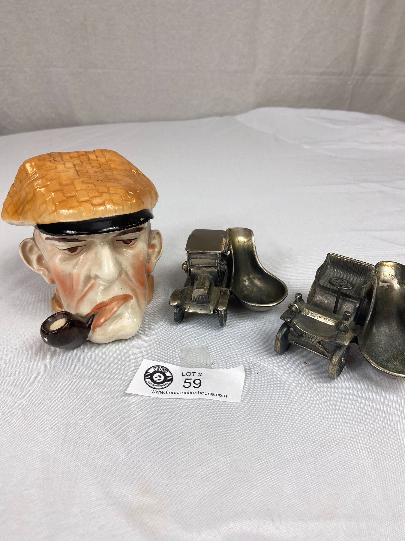 2 Cast Car Pipe Holders Plus Ceramic Tobacco Holder Man with Pipe