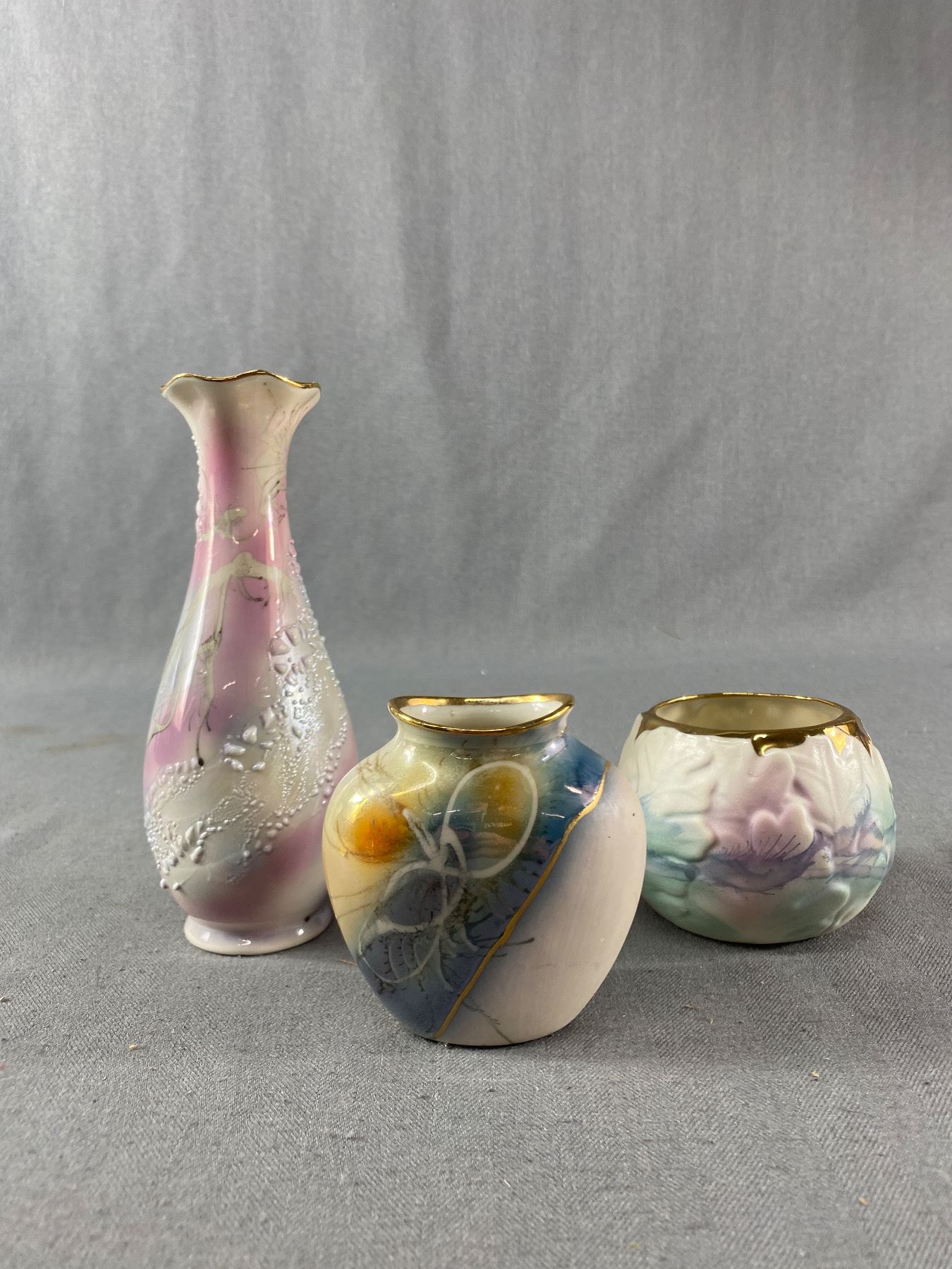 2 Cherish Porcelain Pieces Made In Sorrento B.C.(6.5" H Vase & 2.5" H Bowl) & 1 Signed 3" H Vase