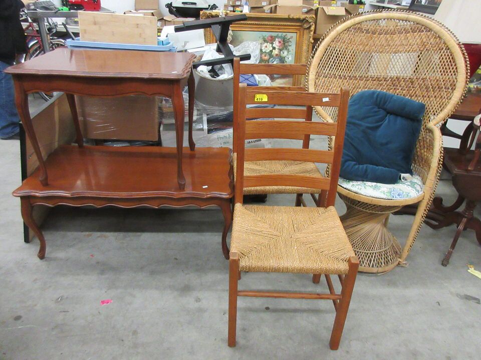 End table, coffee table. 2 wood chairs with rattan seats and a wicker chair.