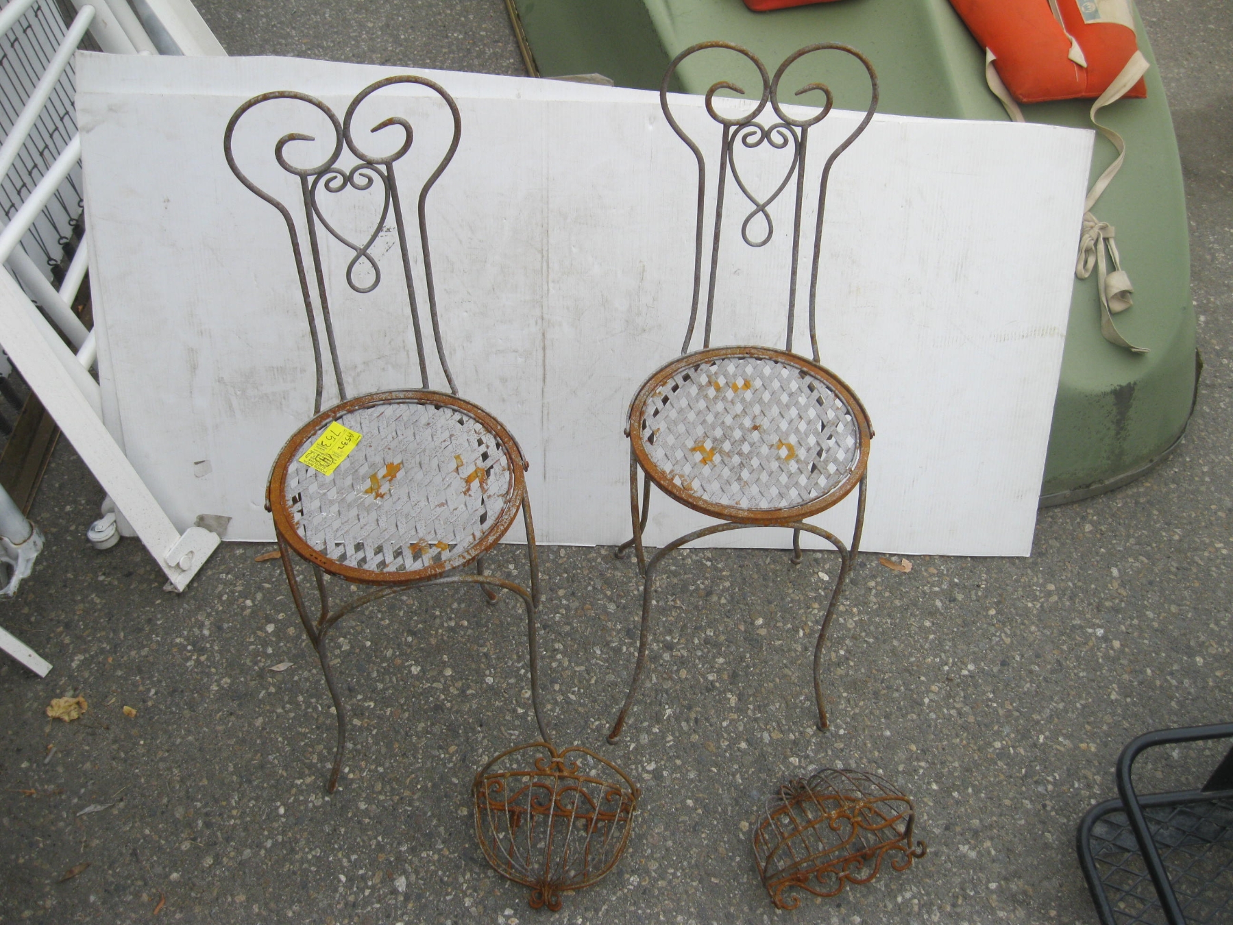 2 DECORATIVE GARDEN PLANTER CHAIRS & WIRE WALL MOUNT PLANTERS