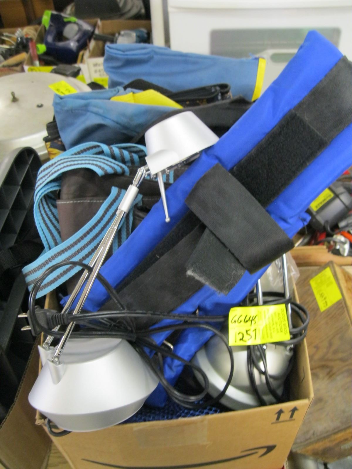 2 DESK LAMPS AND BOX WITH MISC BAGS ETC