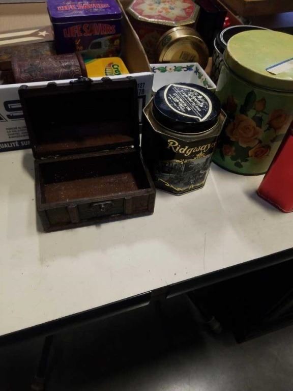 2 DOZEN COLLECTABLE TINS AND WOOD BOXES