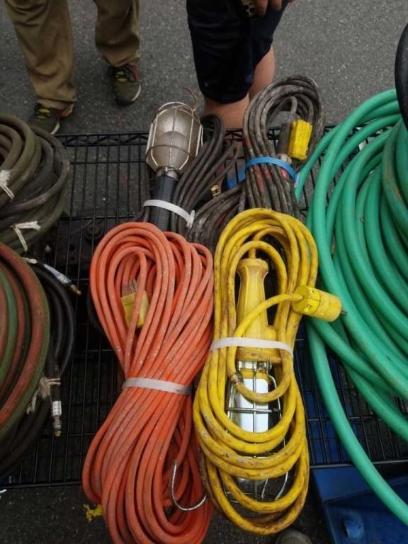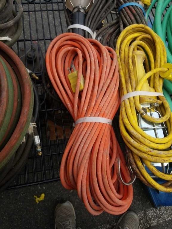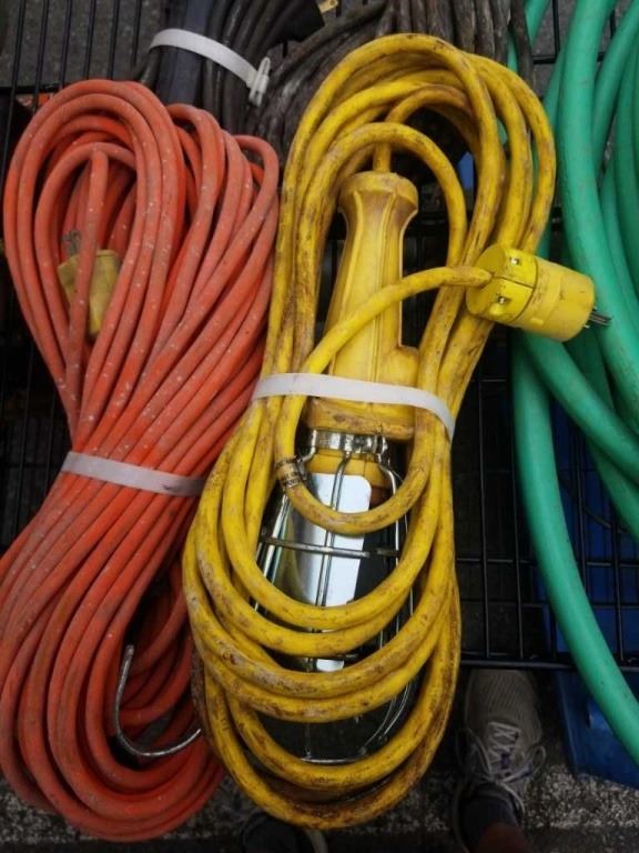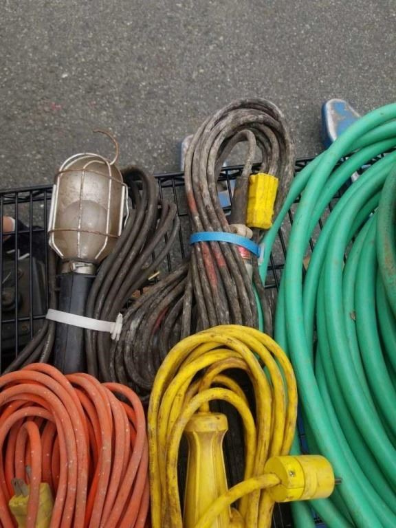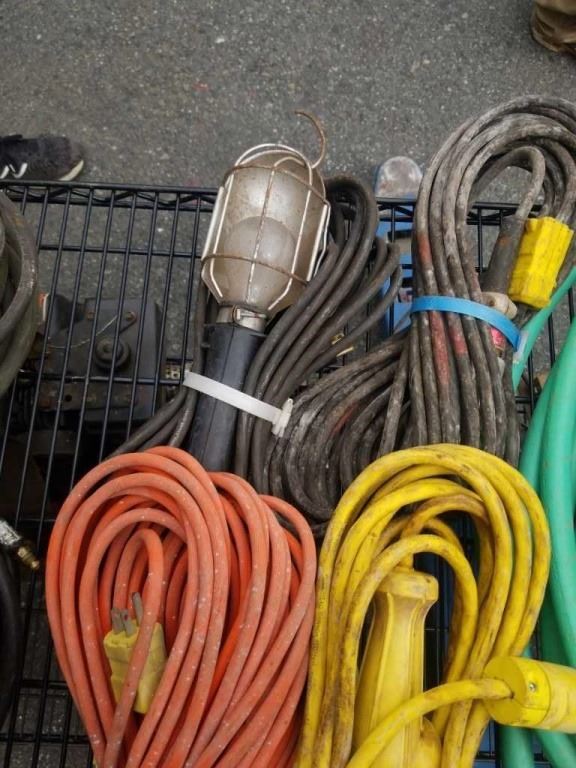 2 EXTENSION CORDS, 2 TROUBLE LIGHTS AND ELECTRIC WEED TRIMMER