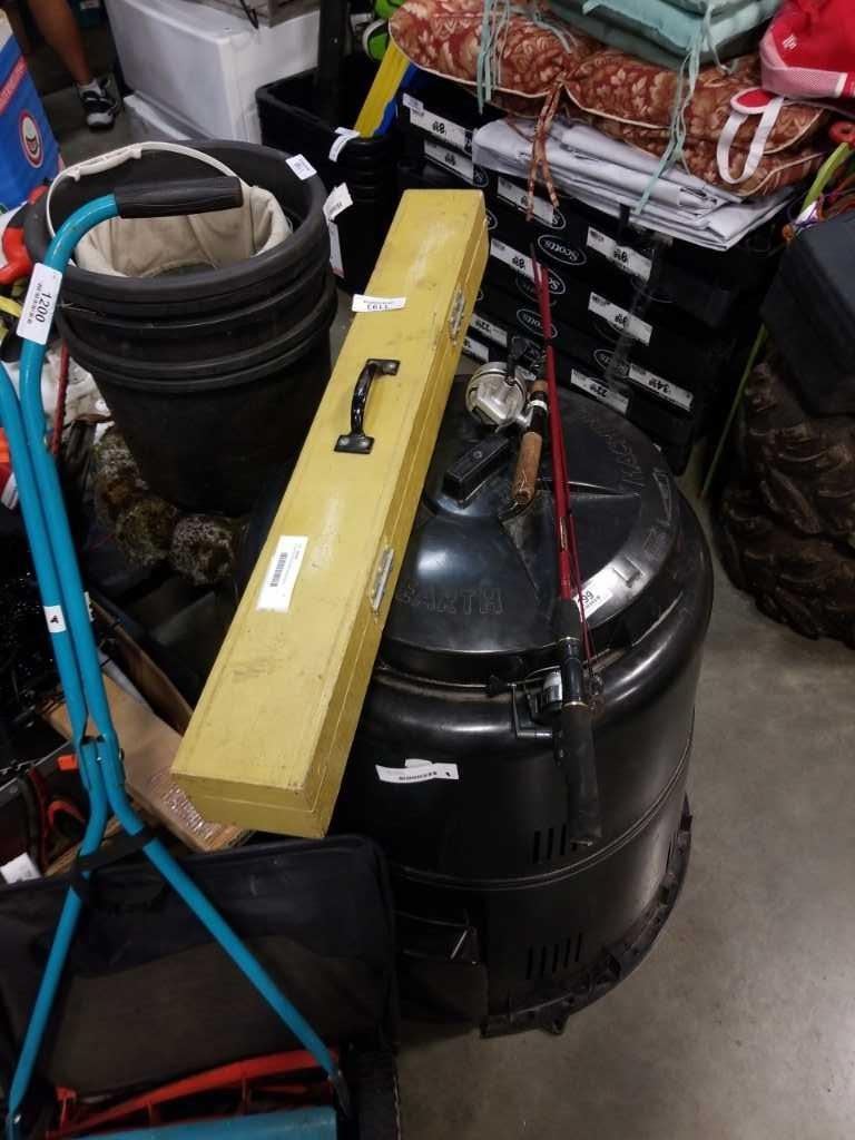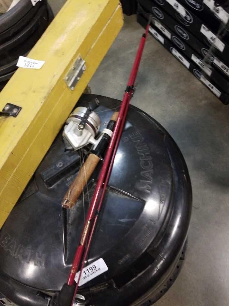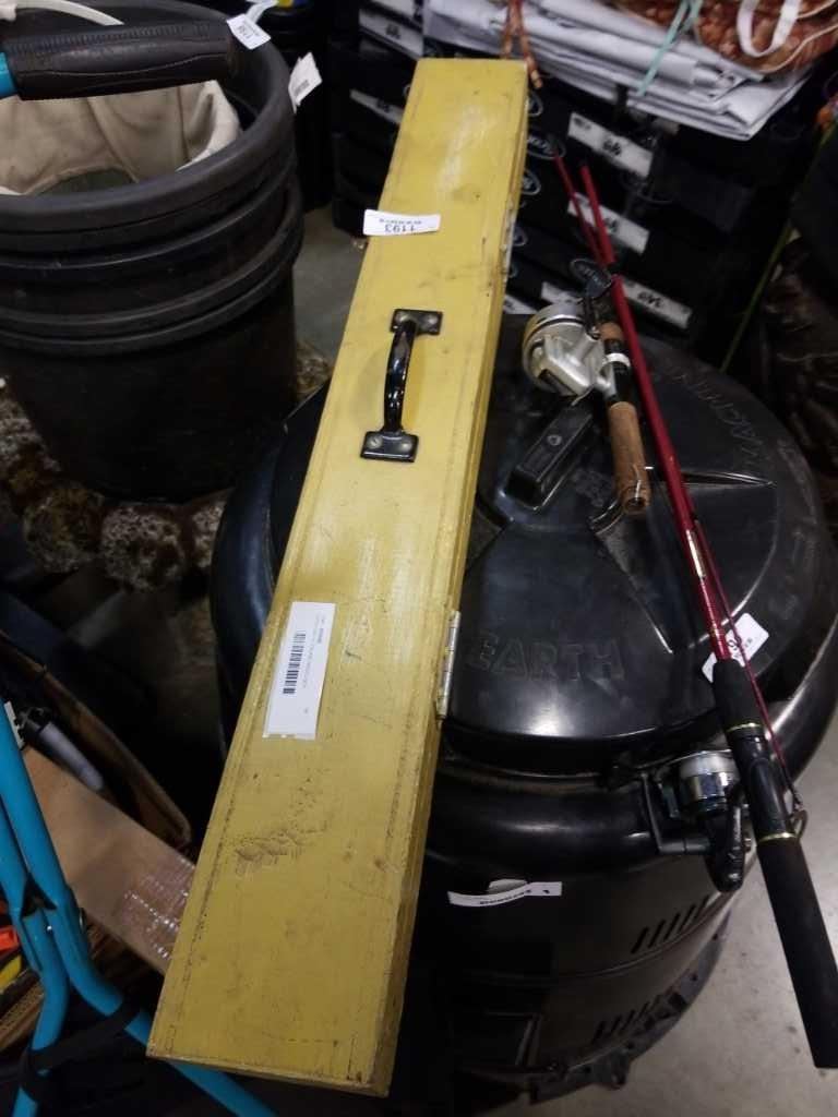 2 FISHING RODS AND WOOD BOX