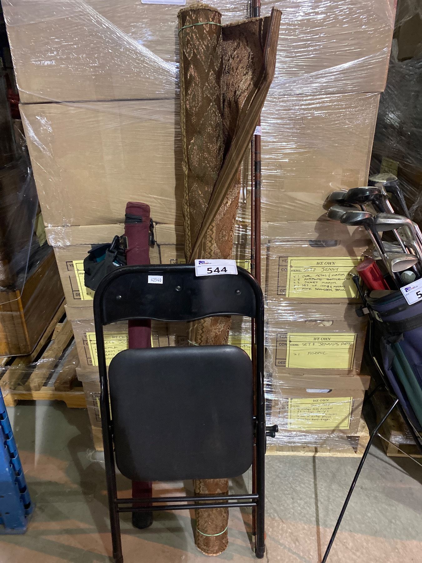 2 FISHING RODS, FOLDING CHAIR AND TAPESTRY