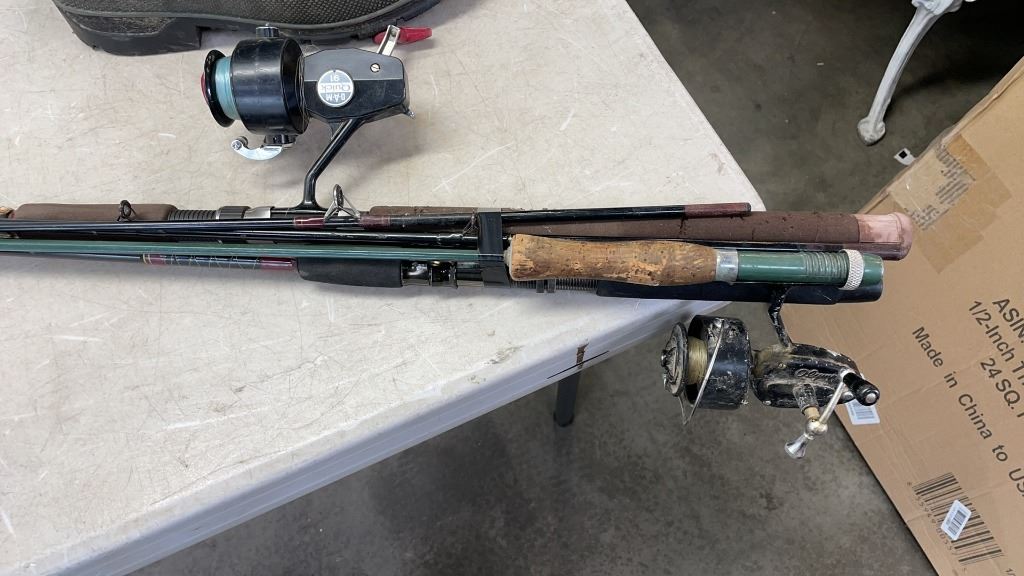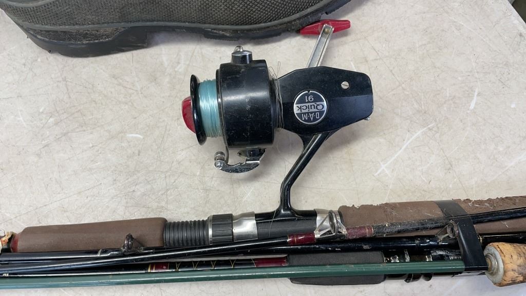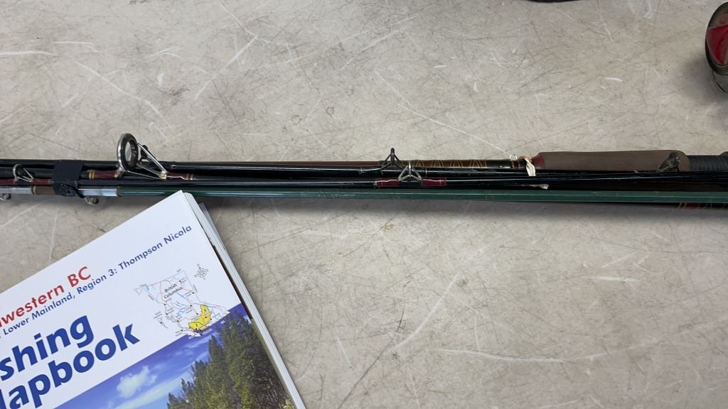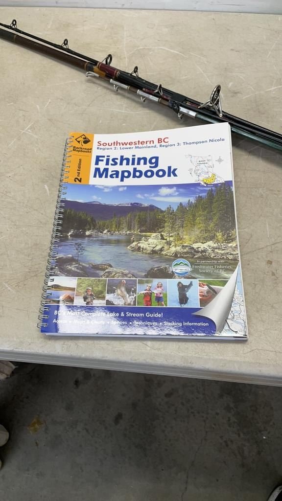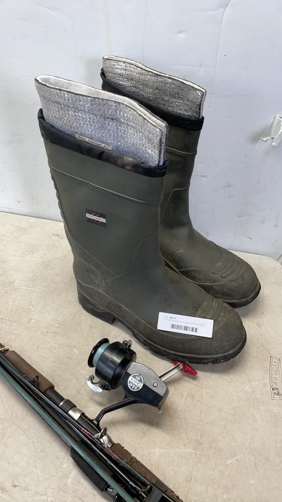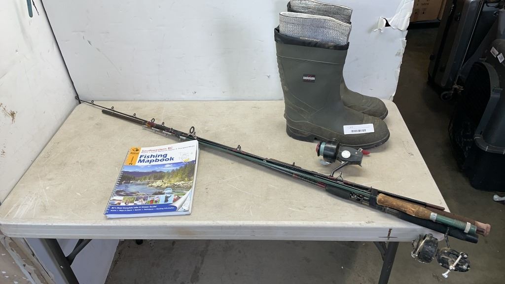 2 FISHING RODS WITH INSULATED RUBBER BOOTS AND FISHING MAPBOOK