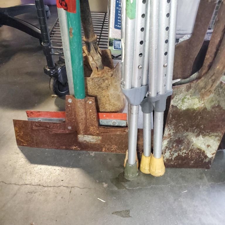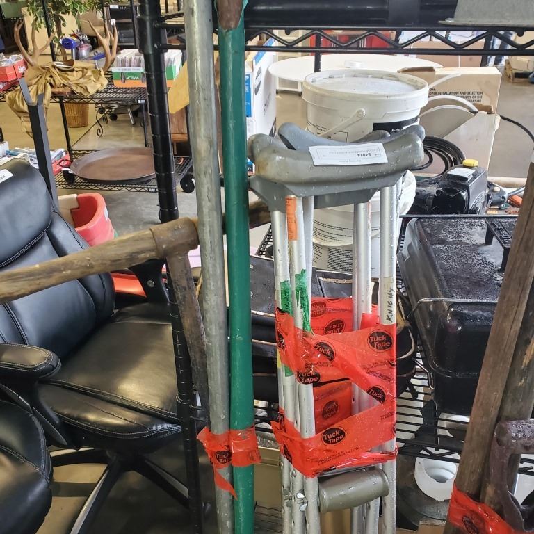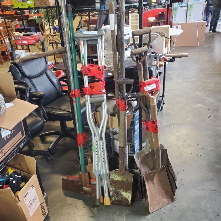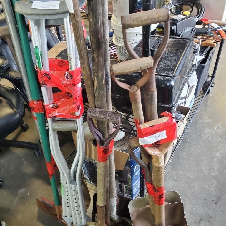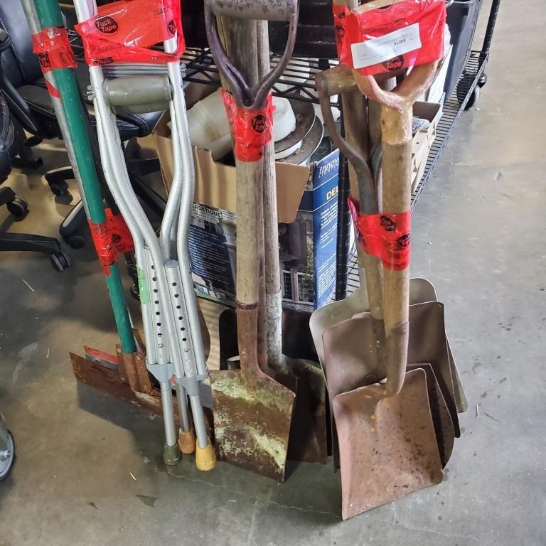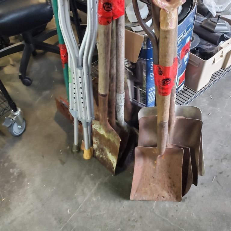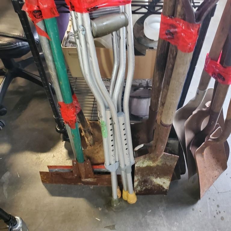 2 FLOOR SCRAPERS AND POST HOLE DIGGER WITH 7 SHOVELS AND CRUTCHES