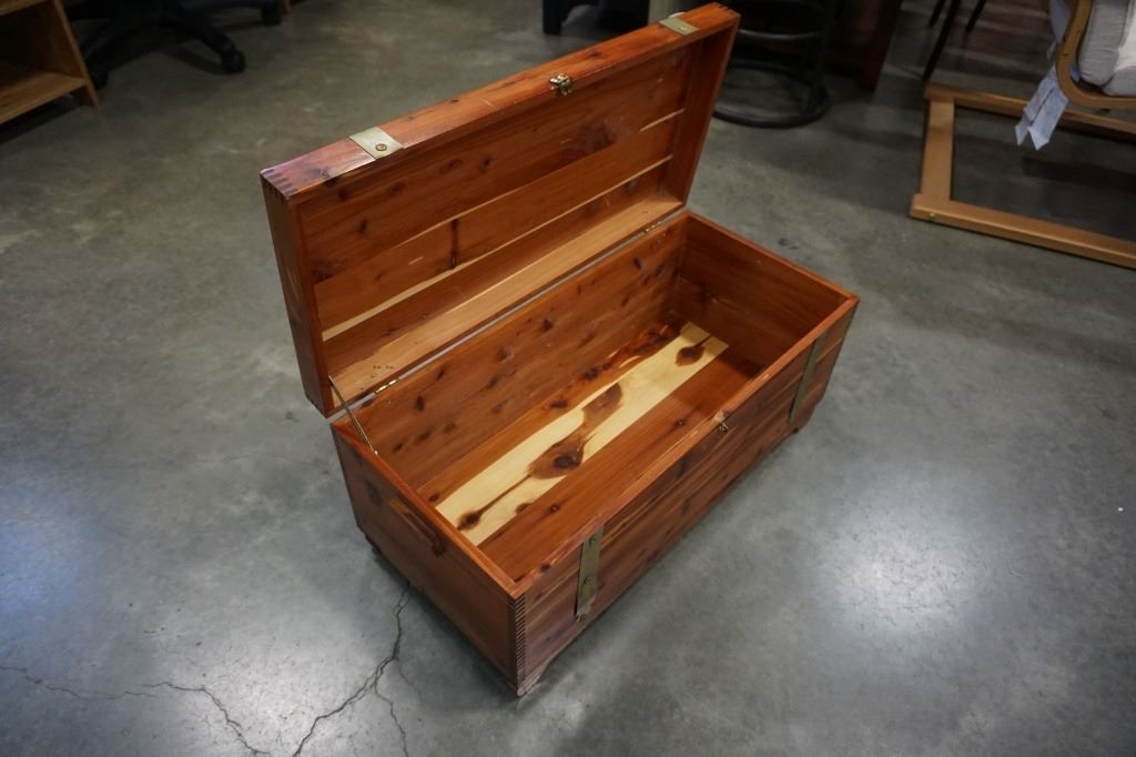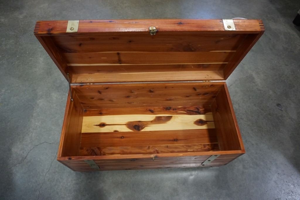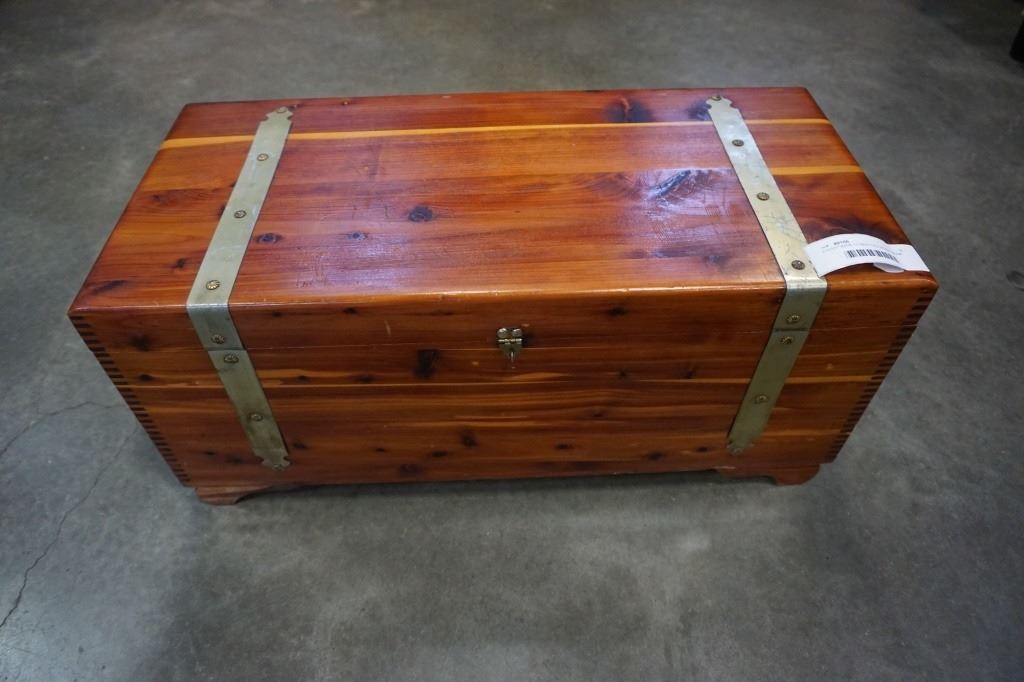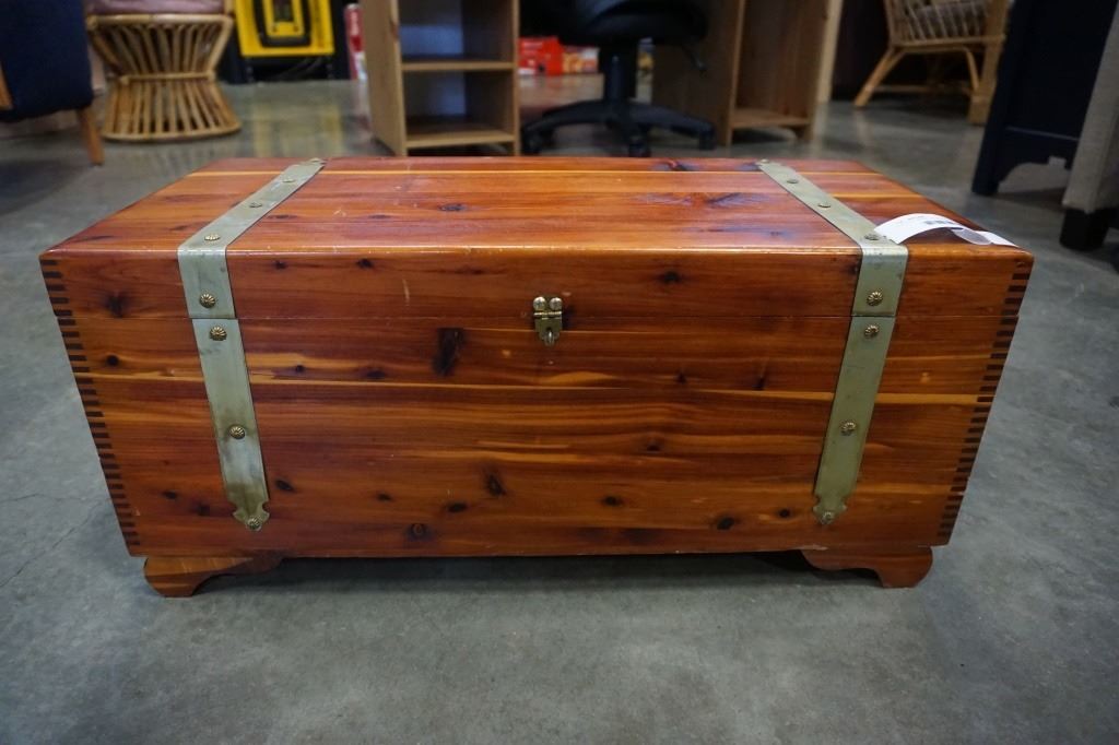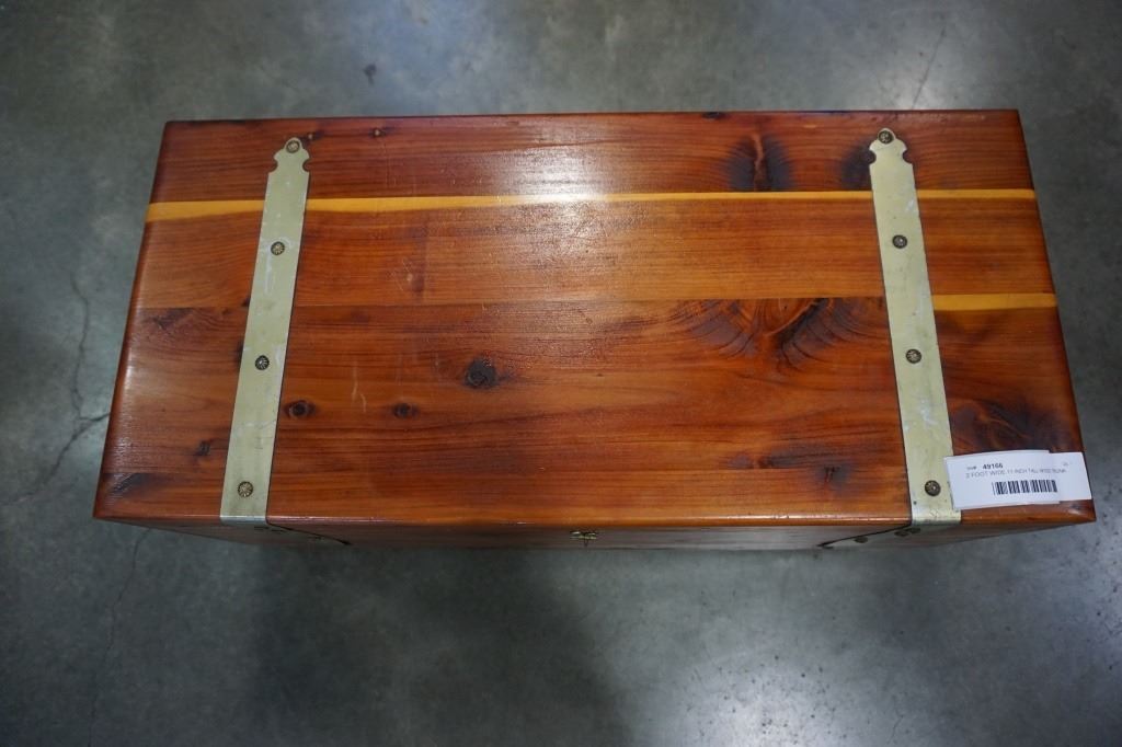 2 FOOT WIDE 11 INCH TALL WOOD TRUNK WITH BRASS ACCENTS