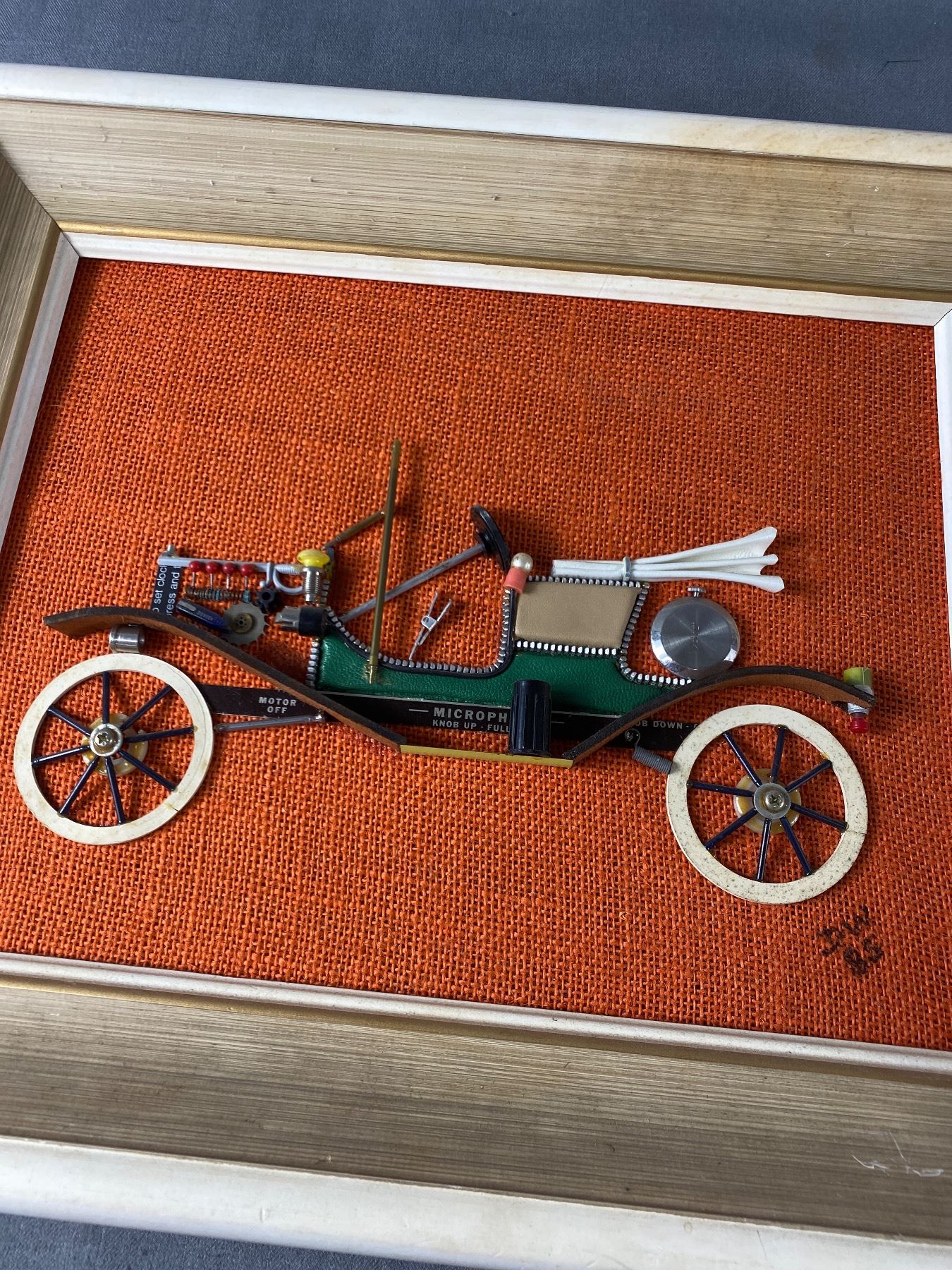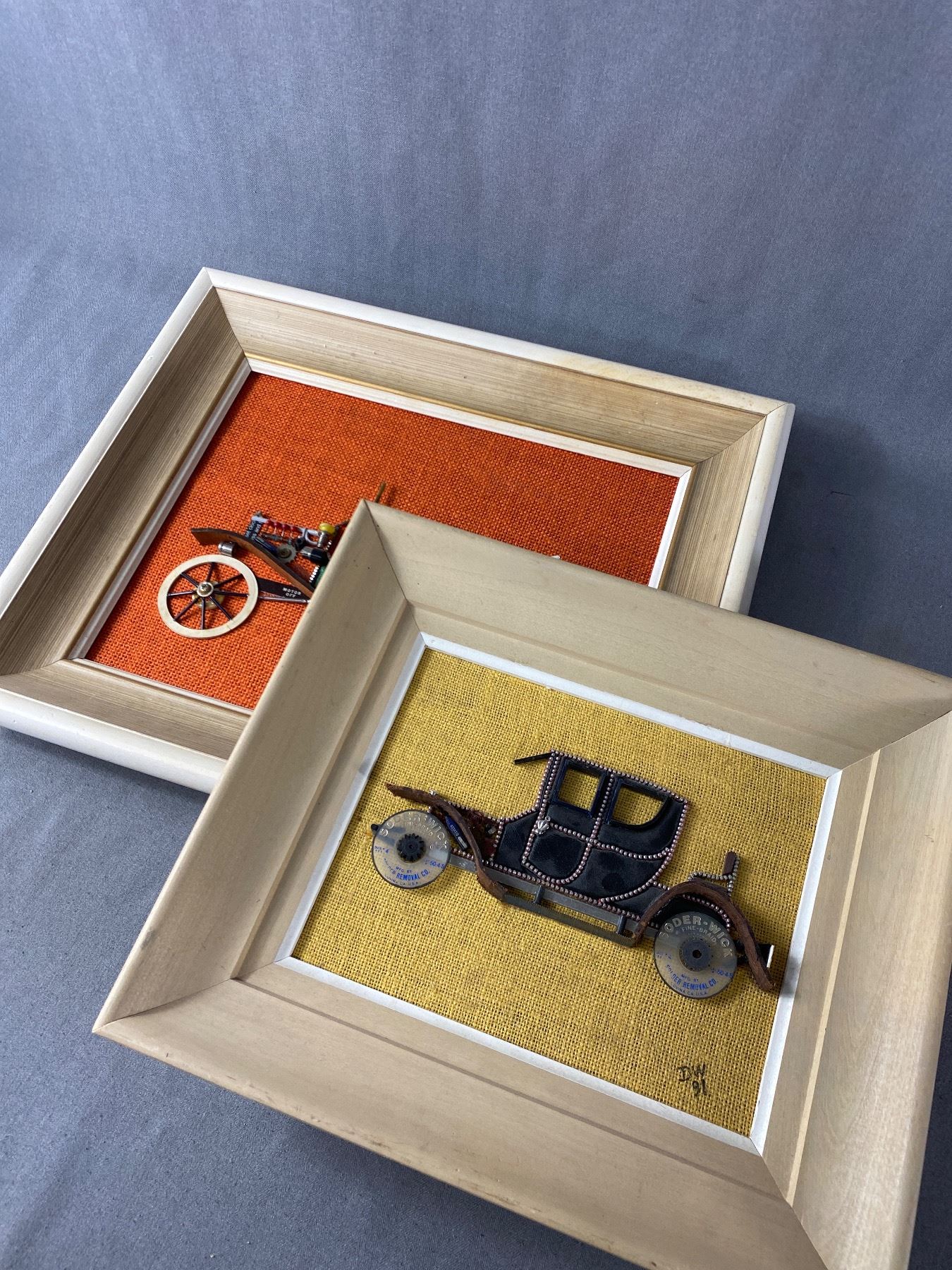 2 Framed Hand Made Early Cars Made Of Parts. Approx. 15" x 12 1/2" & 15 1/2" x 18"