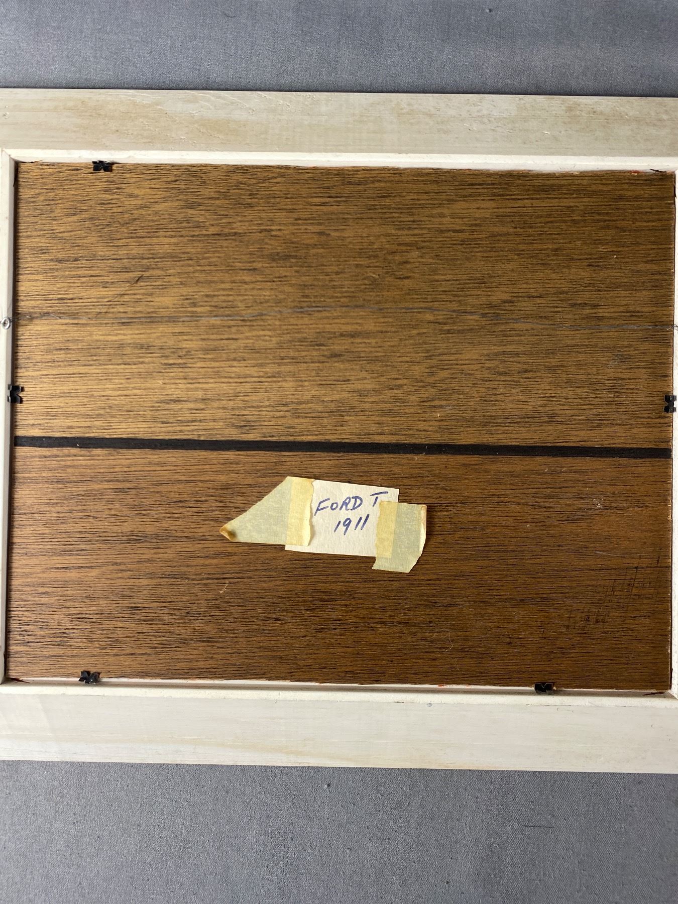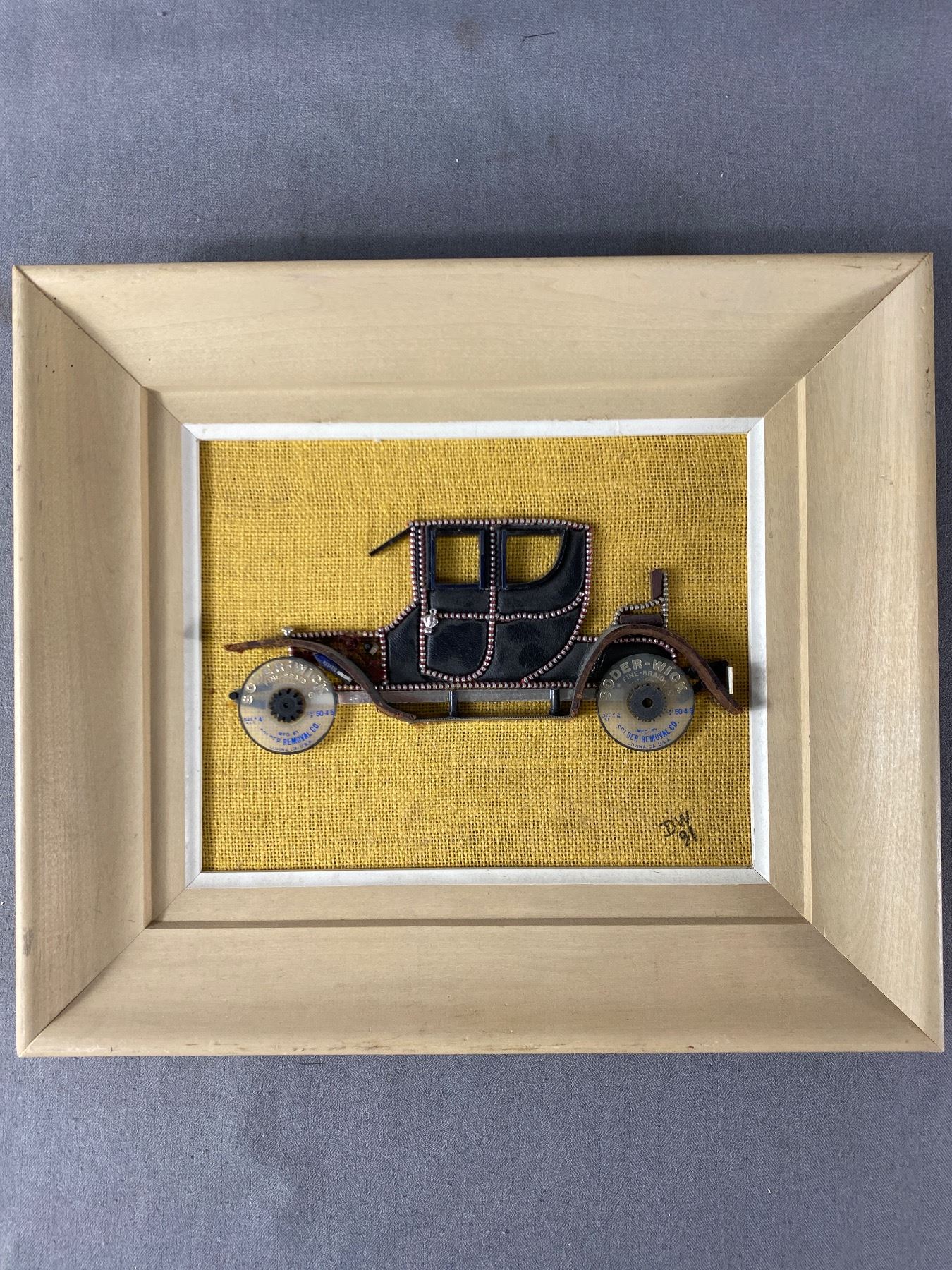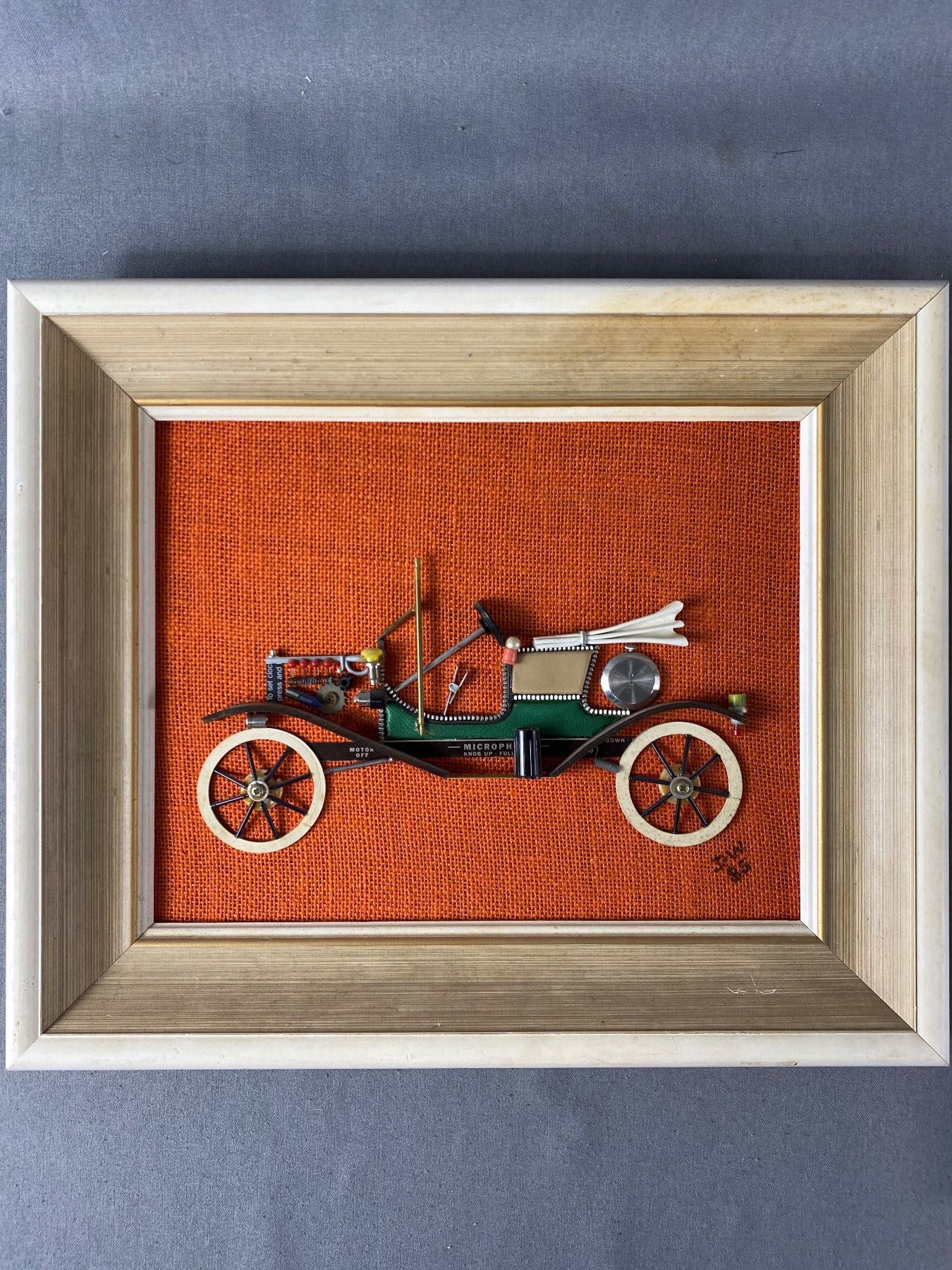 2 Framed Hand Made Early Cars Made Of Parts. Approx. 15  x 12 1/2  & 15 1/2  x 18
