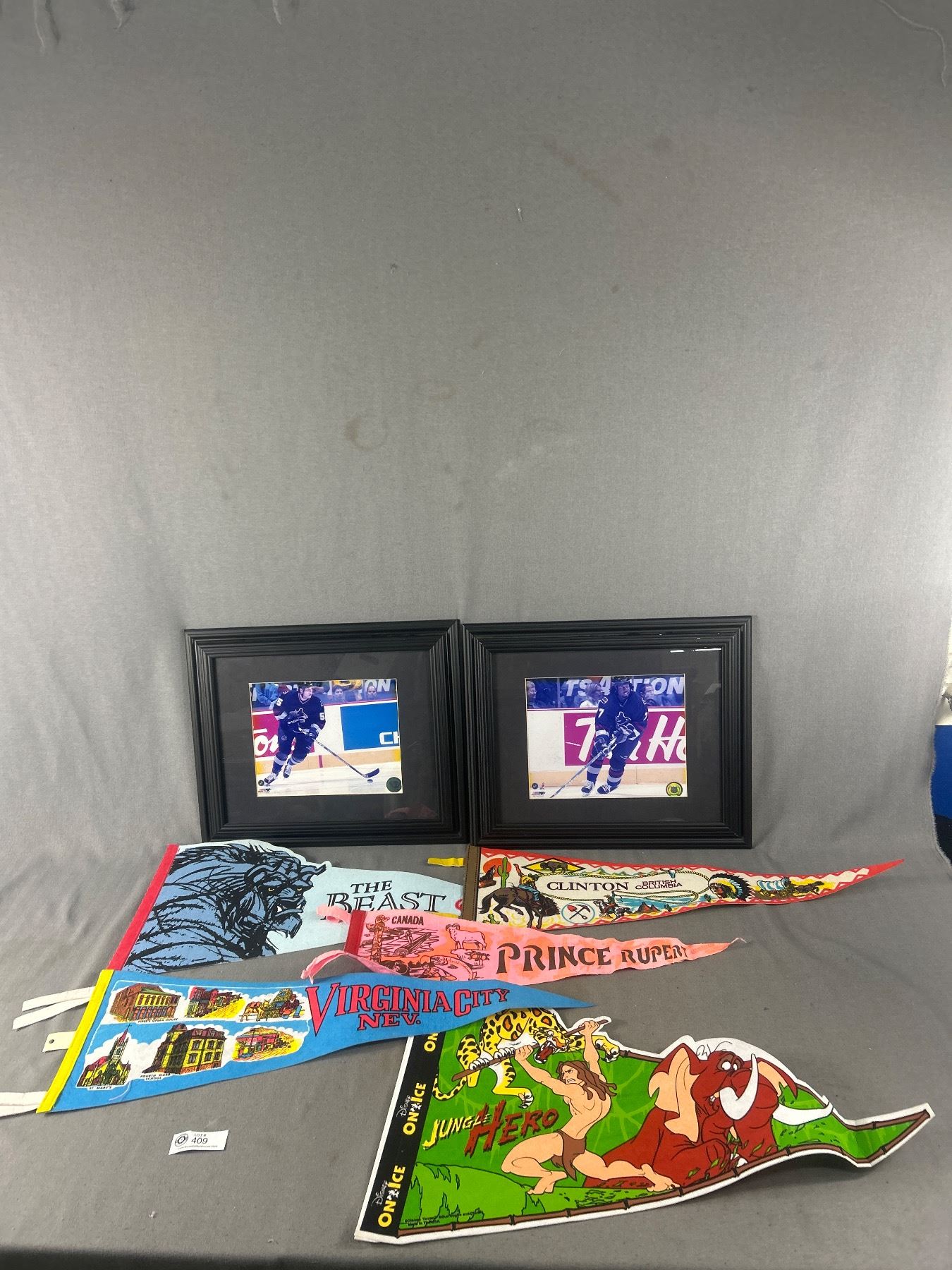 2 Framed Vancouver Canucks NHL Pictures Approx. 17.5" x 14" Plus Souvenir Pennants.