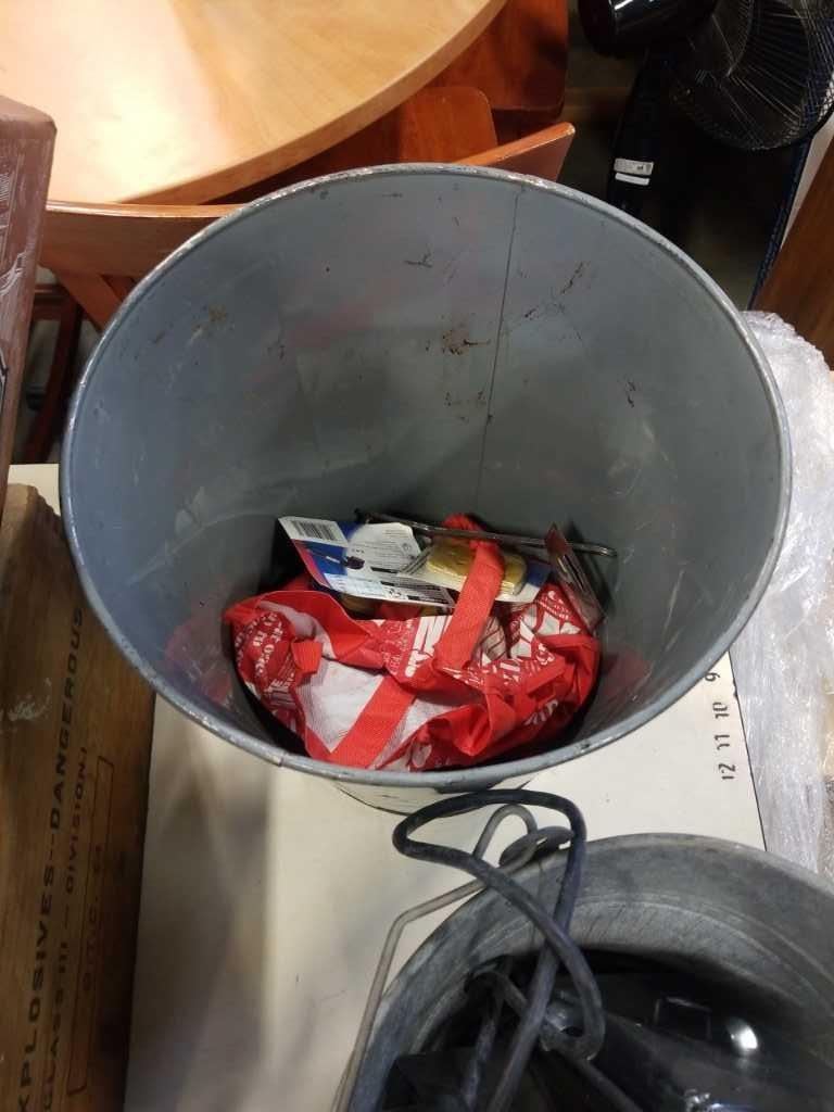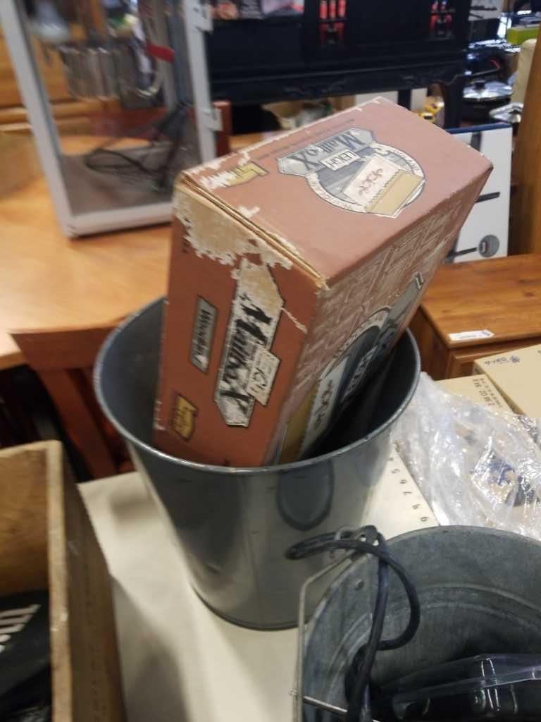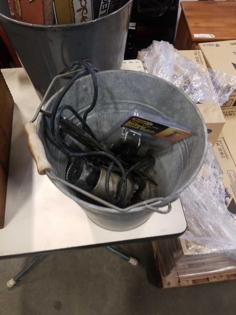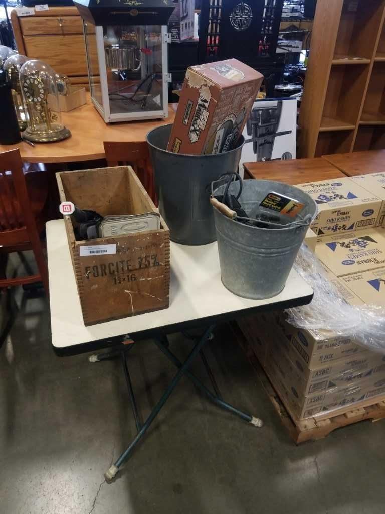 2 GALVANIZED PAILS AND WOODEN EXPLOSIVES CRATE WITH LICENCE PLATES, MAIL BOX AND SHOP SUPPLIES