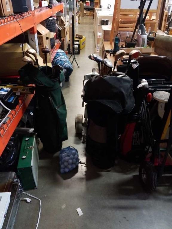 2 GOLF BAGS WITH CLUBS, BALLS AND CART